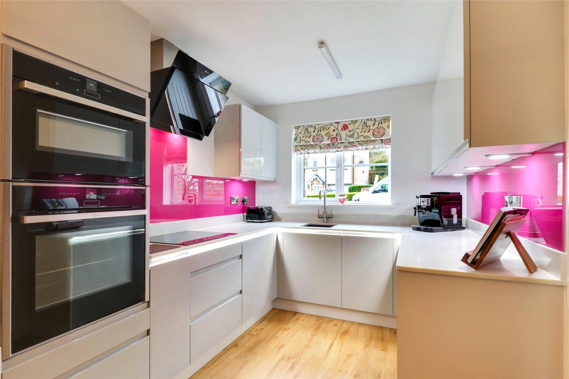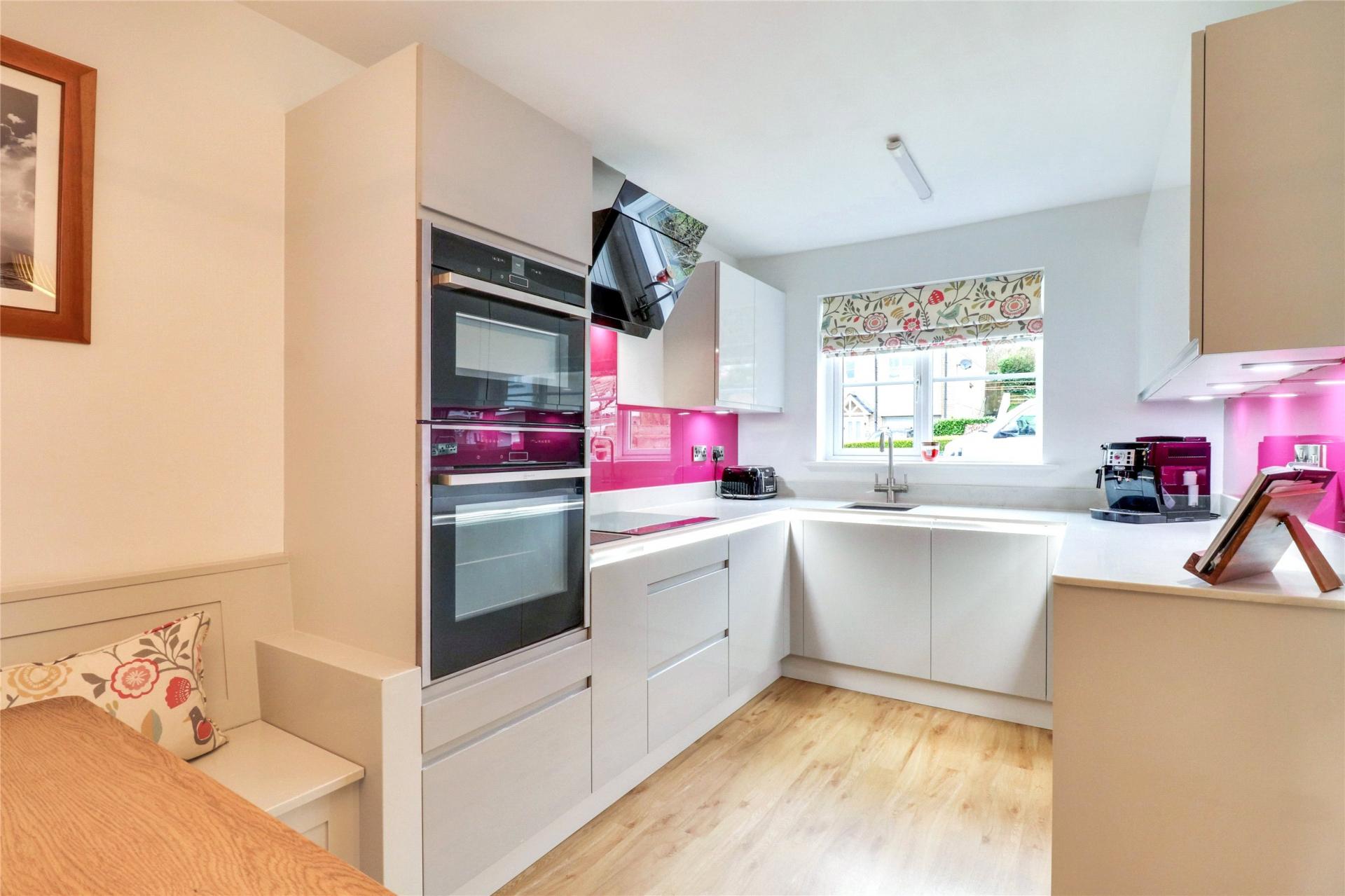 The kitchen presents a sleek and modern aesthetic, showcasing well-coordinated wall and base units. It comes equipped with integrated Neff oven and grill, Neff induction hob, and Neff extractor, as well as the convenience of an integrated dishwasher and under-counter fridge. Furthermore, the layout is thoughtfully designed to accommodate a dining table, complemented by fitted bench seats that offer additional storage space underneath.