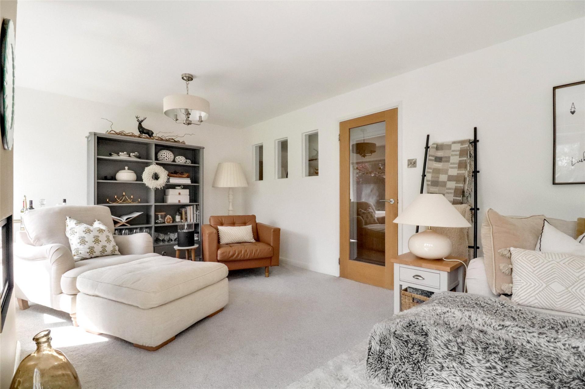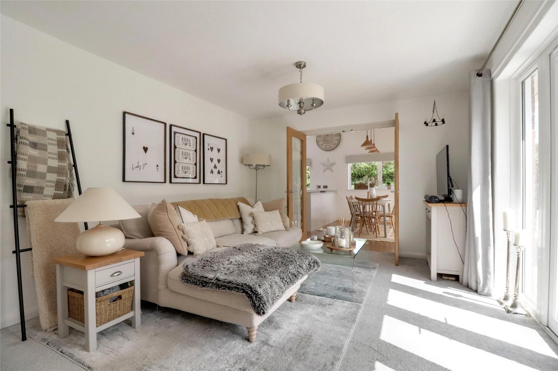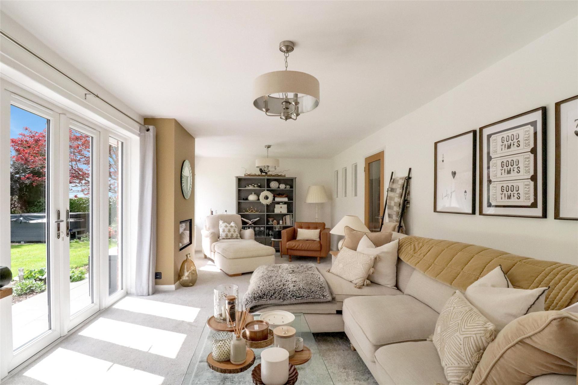 The dining area offers ample space for a large table, with double doors opening onto the terrace and garden beyond. Glazed double doors flow into the elegant sitting room, where a stylish inset gas fire serves as a focal point. This room also has double doors to the terrace and garden, and another door leads back to the hallway.