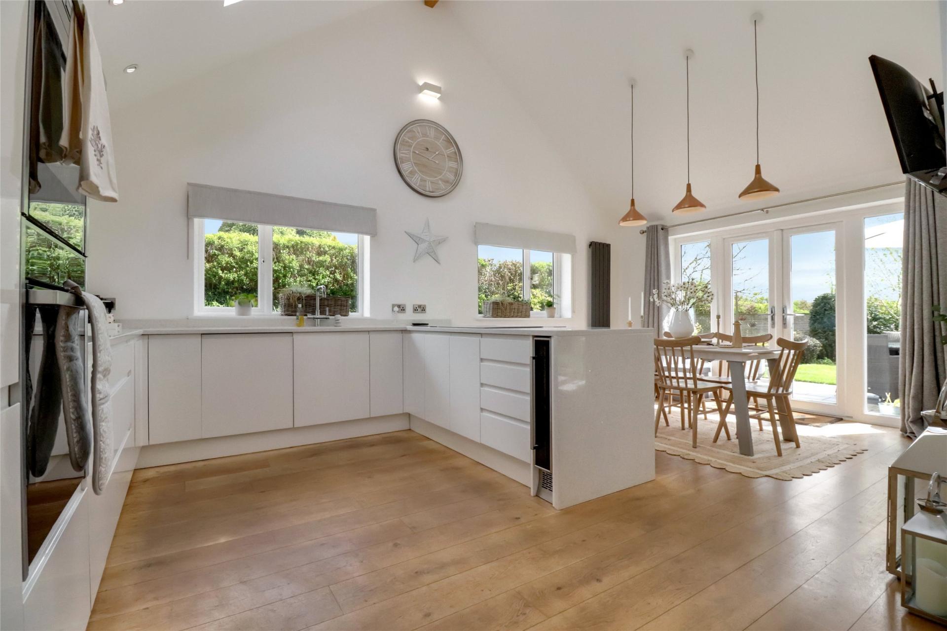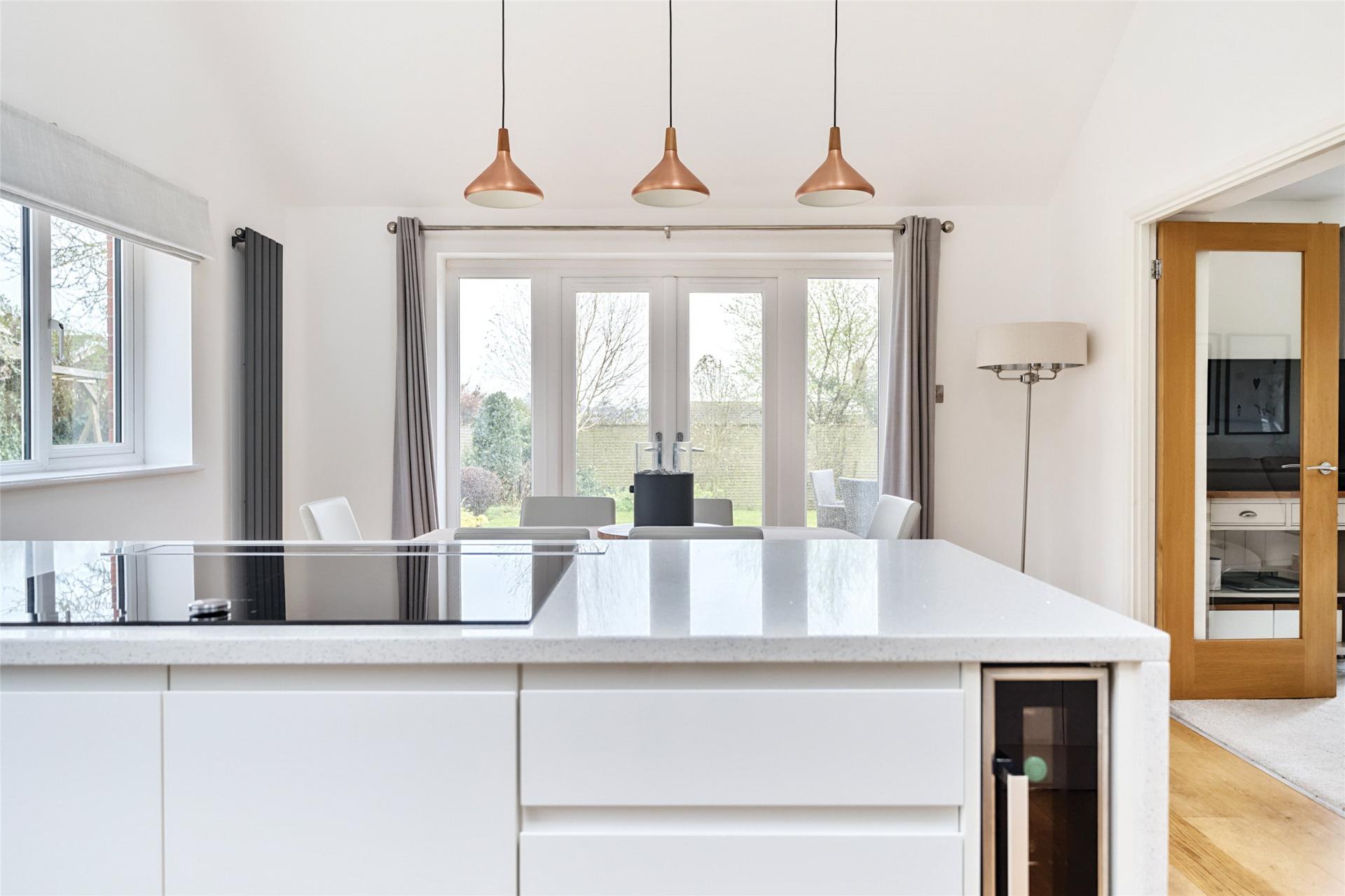 The beautifully appointed kitchen has been thoughtfully designed and fitted with a comprehensive range of modern white units, topped with Silestone quartz worktops. A composite granite sink, large induction hob with downdraft extractor, inset electric double oven and grill, dishwasher, double-height fridge/freezer, and wine cooler complete the high-specification setup. A large utility cupboard provides space and plumbing for white goods, with a door leading out to the driveway.