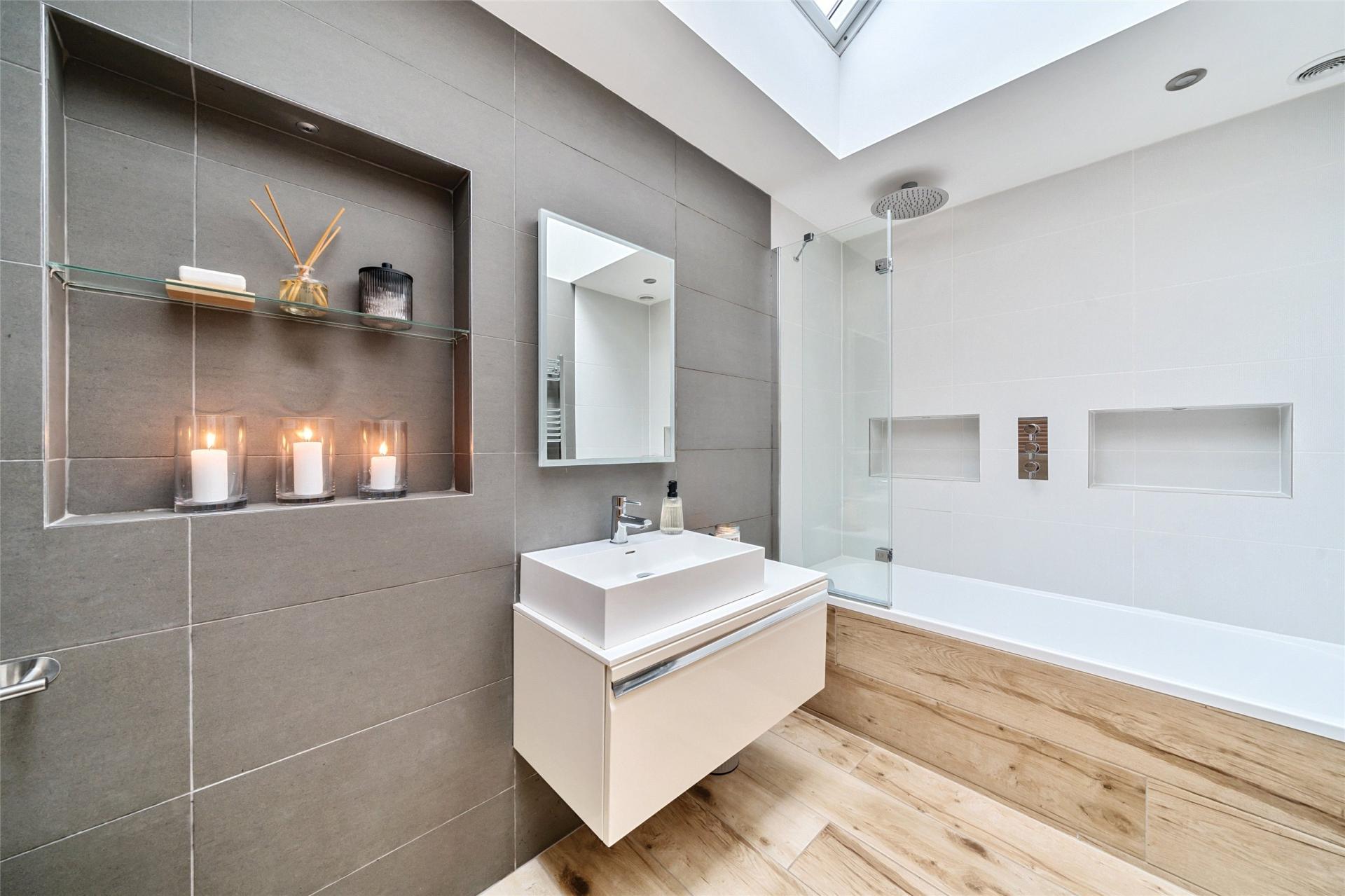 The family bathroom is light and airy with a vaulted ceiling and Velux windows. It includes a vanity unit with an illuminated mirror above, a WC with hidden cistern, a bath with rainfall shower over, and an airing cupboard.