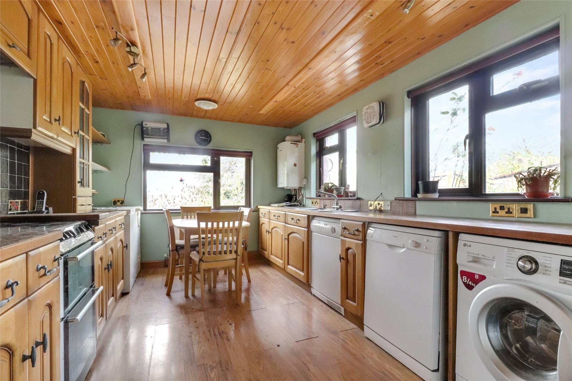 The kitchen is well-equipped with wooden wall and base units, a freestanding cooker, and space and plumbing for white goods, while offering lovely views over the rear garden and countryside beyond; a door provides direct access to the garden.