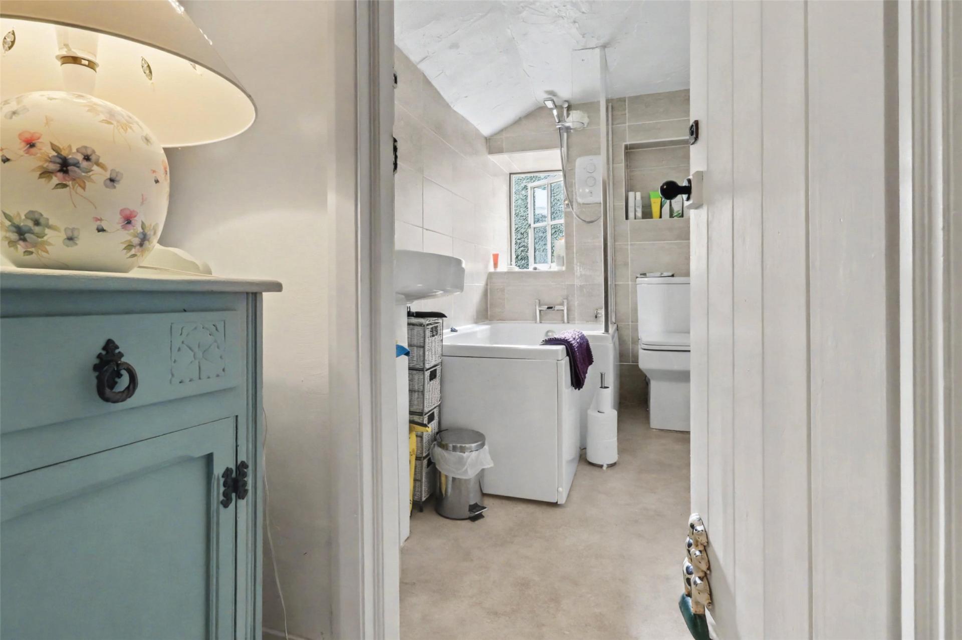 The bathroom is tiled and fitted with a modern white three-piece suite, including an L-shaped shower bath, Triton shower unit over, and a glass screen.