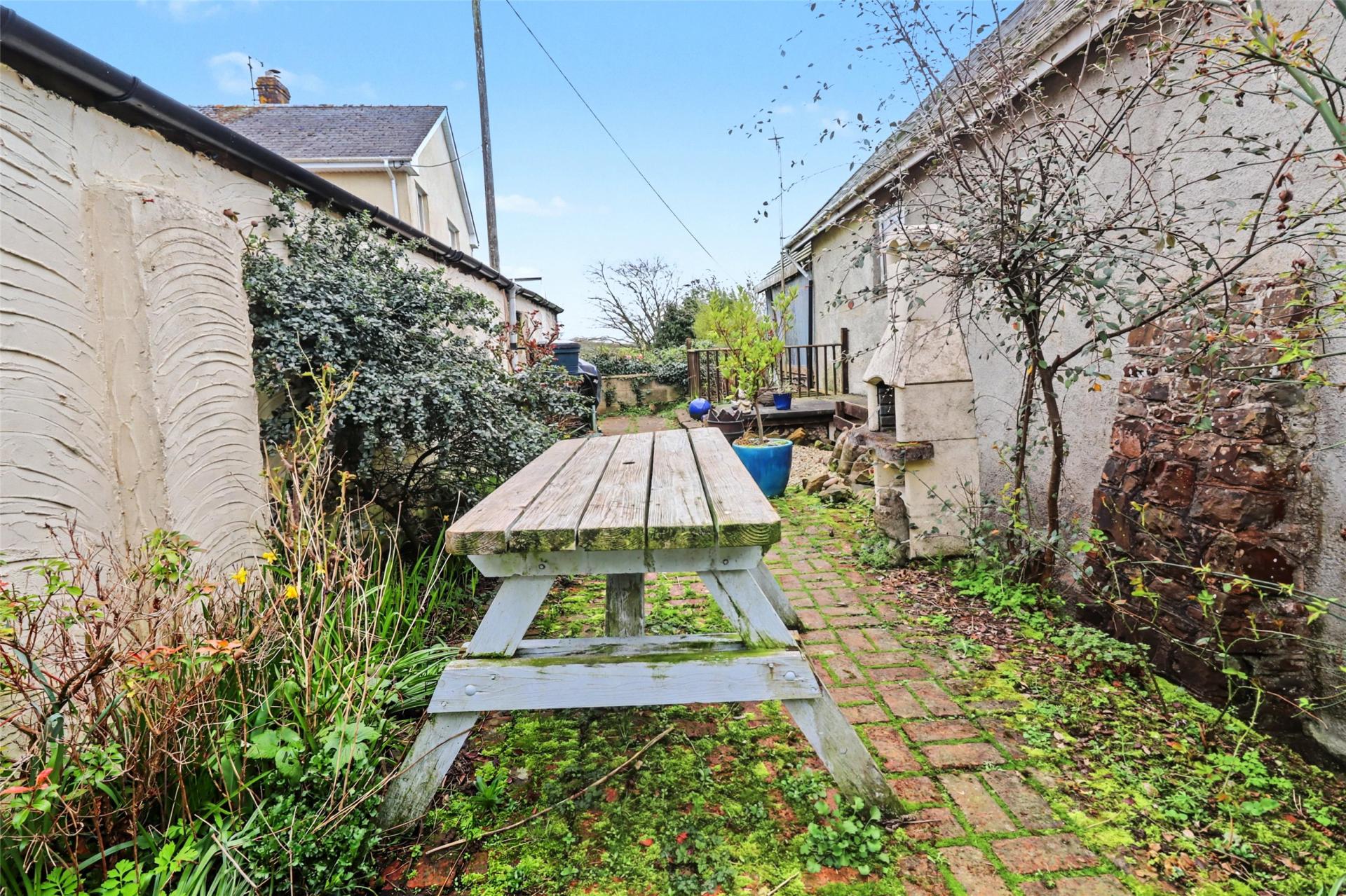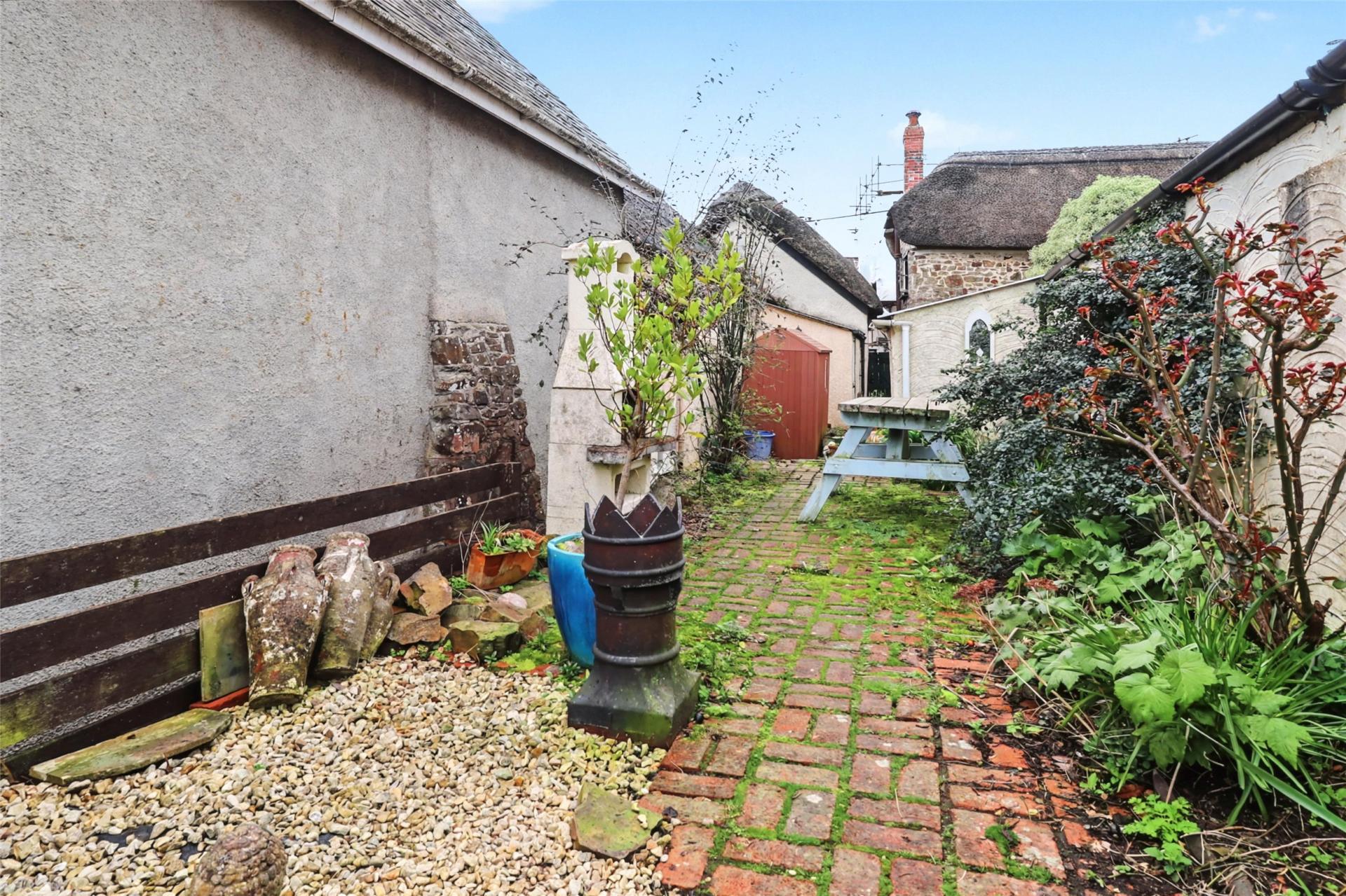 A brick-paved pathway runs alongside the cottage leading to the rear enclosed cottage garden, which includes a gravelled seating area.