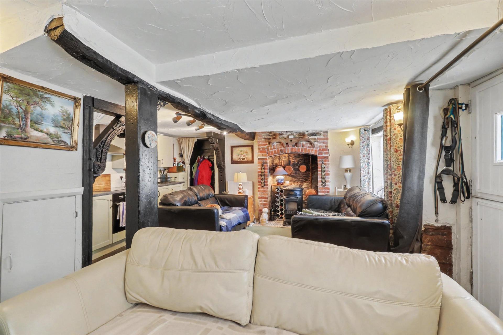 The property is accessed from the front via a stable-style door, which opens into the living room and kitchen, forming a delightful open-plan space full of character. This room features two front-facing windows, a fireplace with an attractive stone surround, and numerous exposed ceiling and wall timbers, adding to the cottages historic charm.
