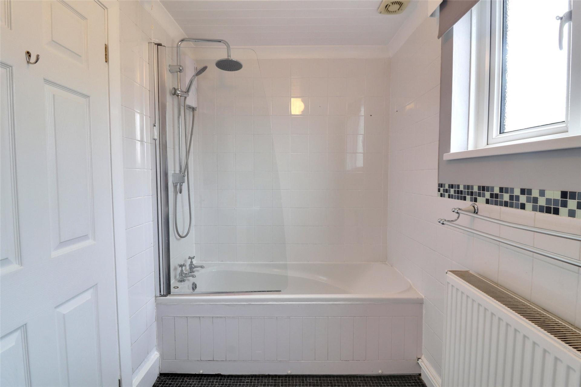 The kitchen is well-equipped with matching wall and base units, an inset stainless steel sink, space and plumbing for under-counter white goods, and room for a freestanding cooker. A practical breakfast bar adds extra functionality for casual dining or meal prep. From the kitchen, a secondary hallway provides access to the rear garden and leads to the family bathroom, which comprises a panelled bath with electric shower over, WC, and hand wash basin.