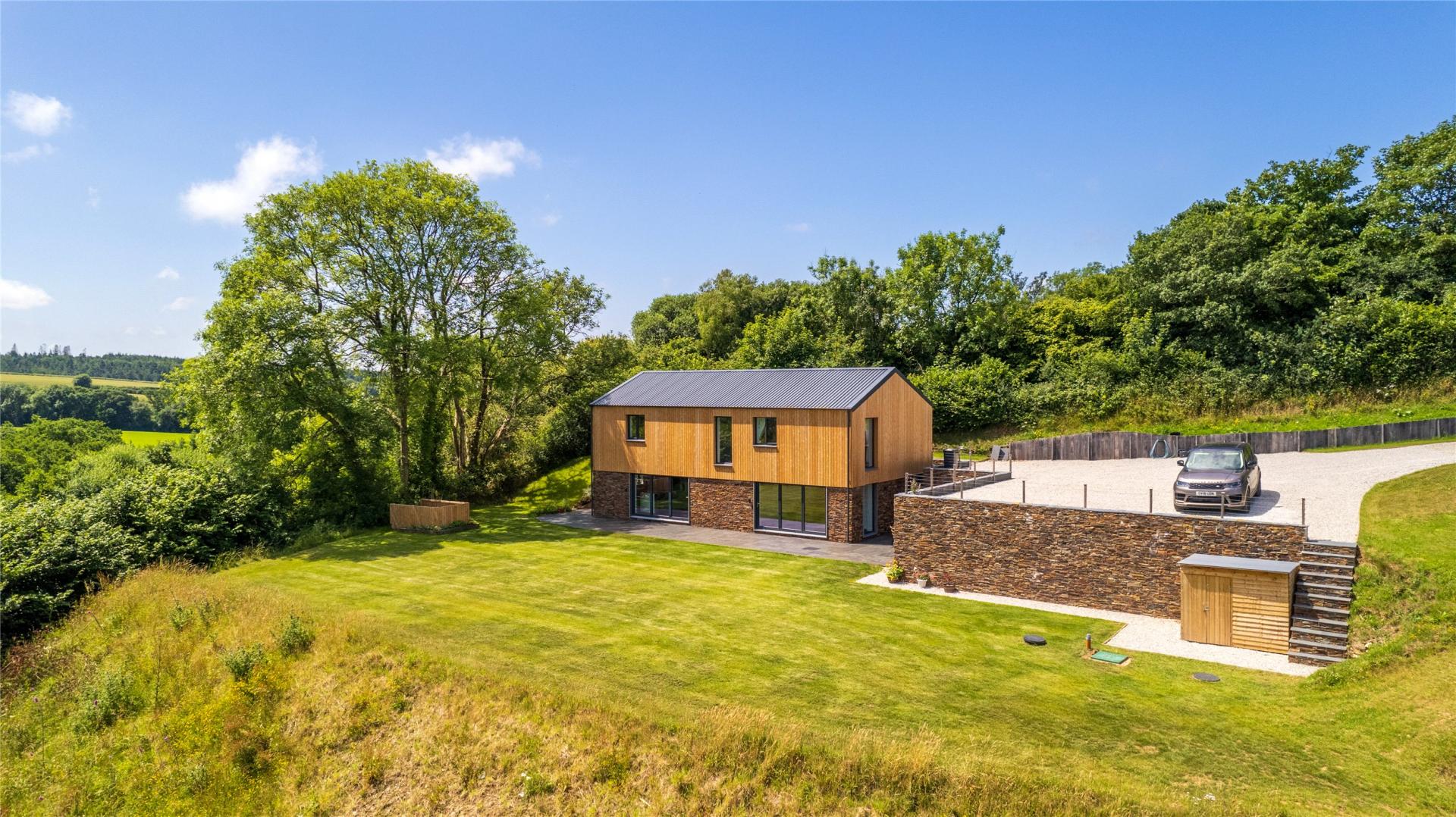 Coming through the pair of fivebar gates at the head of the drive the setting and countryside opens up in front and to the side. Just through the gates is ample room for a boat/horsebox/motorhome whilst the driveway slopes gently off to the side having ample room for multiple vehicle and bordered on one side by a sleeper retaining wall behind which the vendor has laid cable to allow for lighting, an EV charger connection and for those who may wish to install, electric gates.