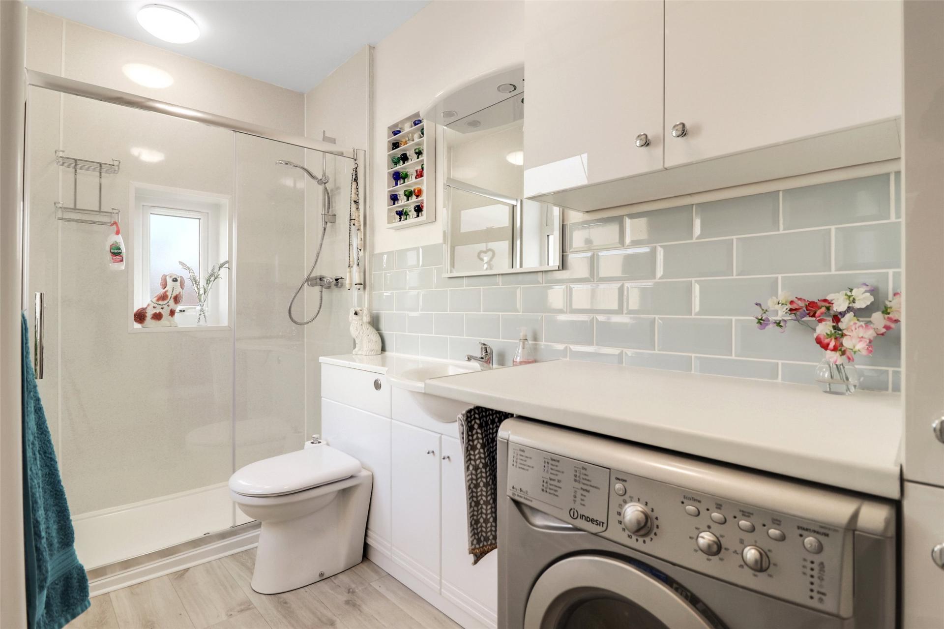 The kitchen is fitted with a range of attractive wooden wall and base units, complemented by ample worktop space. A contemporary ground-floor shower room sits just off the kitchen, complete with walk-in shower, WC, wash basin, and plumbing for a washing machine.