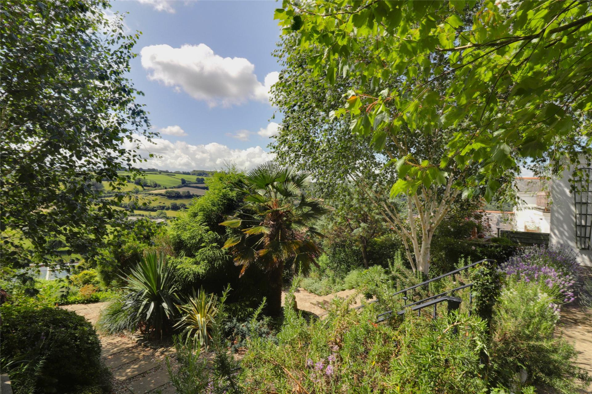 Multiple seating areas are thoughtfully positioned throughout, offering both sun and shade at different times of the day. One of the lower terraces, surrounded by mature shrubs and vibrant planting, creates an idyllic setting for alfresco dining with the dramatic backdrop of the Torridge Valley unfolding beyond.