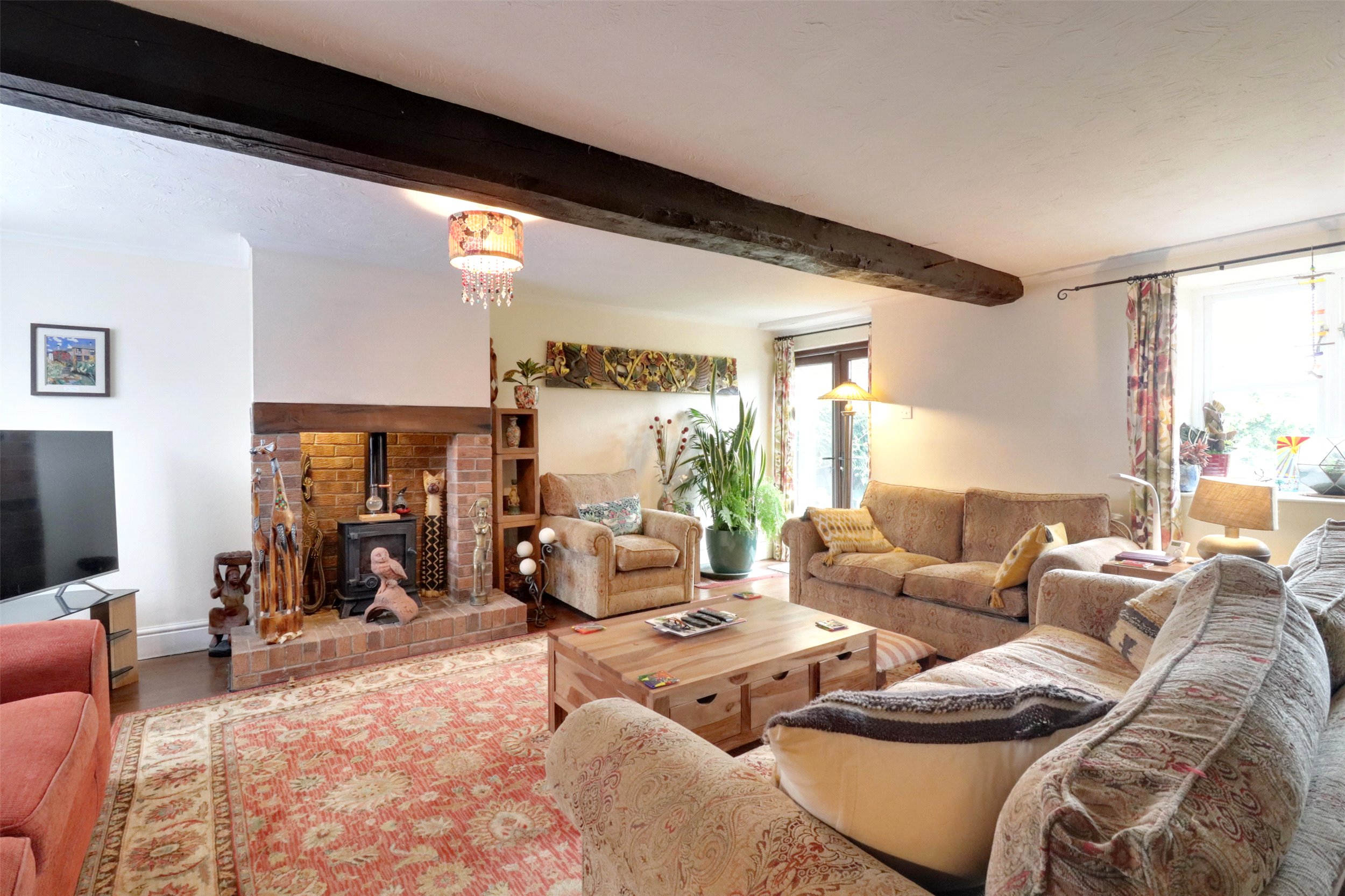 Beyond a charming enclosed courtyard with raised flower beds, the front door opens into a welcoming hallway with a useful under-stairs storage cupboard. To the front of the home lies a cosy sitting room, while the generous dining room flows seamlessly into a bright and airy garden room. Flooded with natural light, this space enjoys uninterrupted views over the garden and the rolling countryside beyonda perfect spot to relax and unwind.