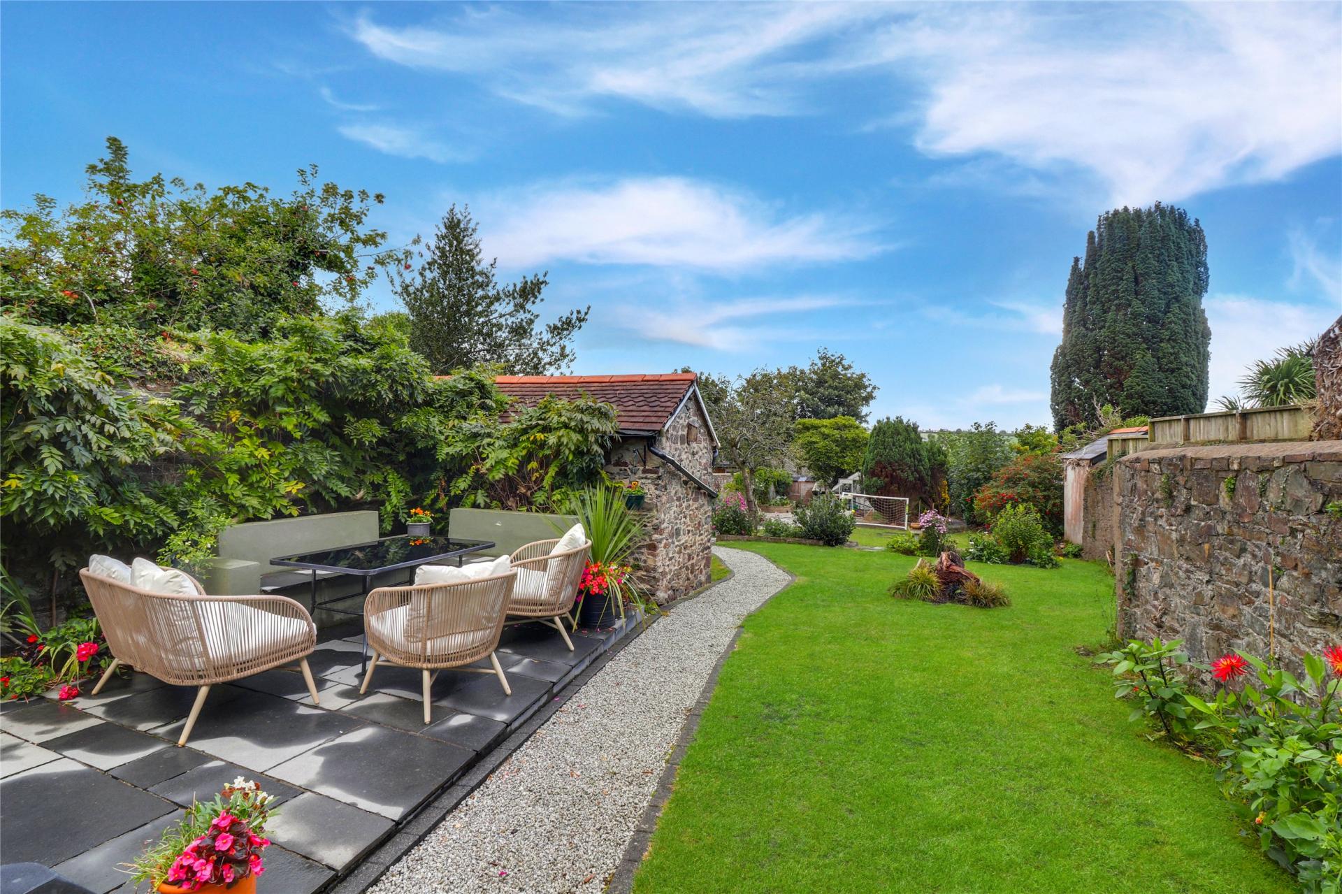 The rear garden is a real highlight. Landscaped to create a private and sunny retreat, it offers a blend of gravel pathways, lawned areas and paved terraces. Directly off the kitchen is a stone-paved patio with built-in seating, perfect for summer gatherings. Further down the garden you'll find a second seating area, a stone outbuilding, wooden storage shed, and a mature planting scheme with shrubs, trees and flowering borders. At the end of the garden is a gently sloping path leading to the garage and driveway, with gated access to the nearby Health Centre car park. The garage also includes a personal door for added convenience.