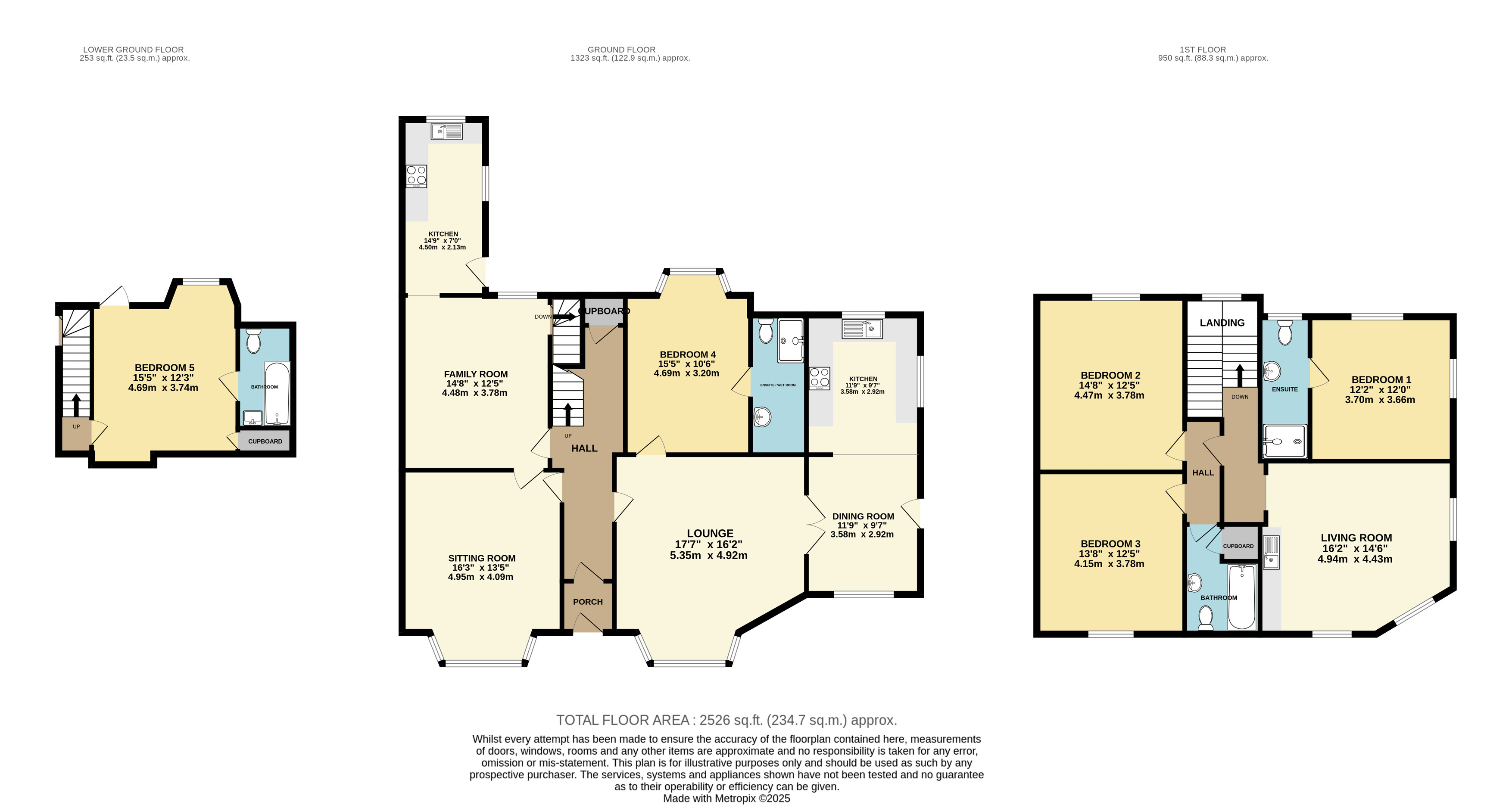 The ground floor comprises a sitting room, family room, lounge, dining room and kitchen, along with a family bathroom and a fourth bedroom. To the second floor there are three further bedrooms, a living room and an additional bathroom. There is a further bedroom to the lower ground floor.
