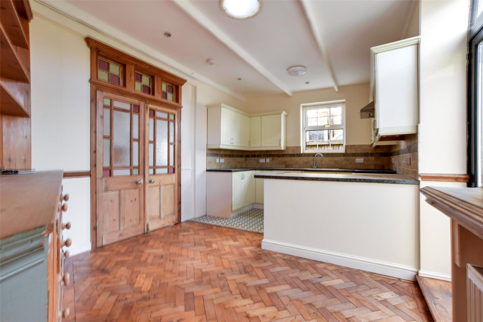 Towards the rear of the property is the kitchen/diner, designed to offer both practicality and a sociable feel. A mix of parquet and laminate flooring defines the space, which comfortably accommodates a breakfast table or informal dining area. French doors open directly onto the rear garden, filling the room with natural light and creating a seamless indooroutdoor connection during the warmer months.