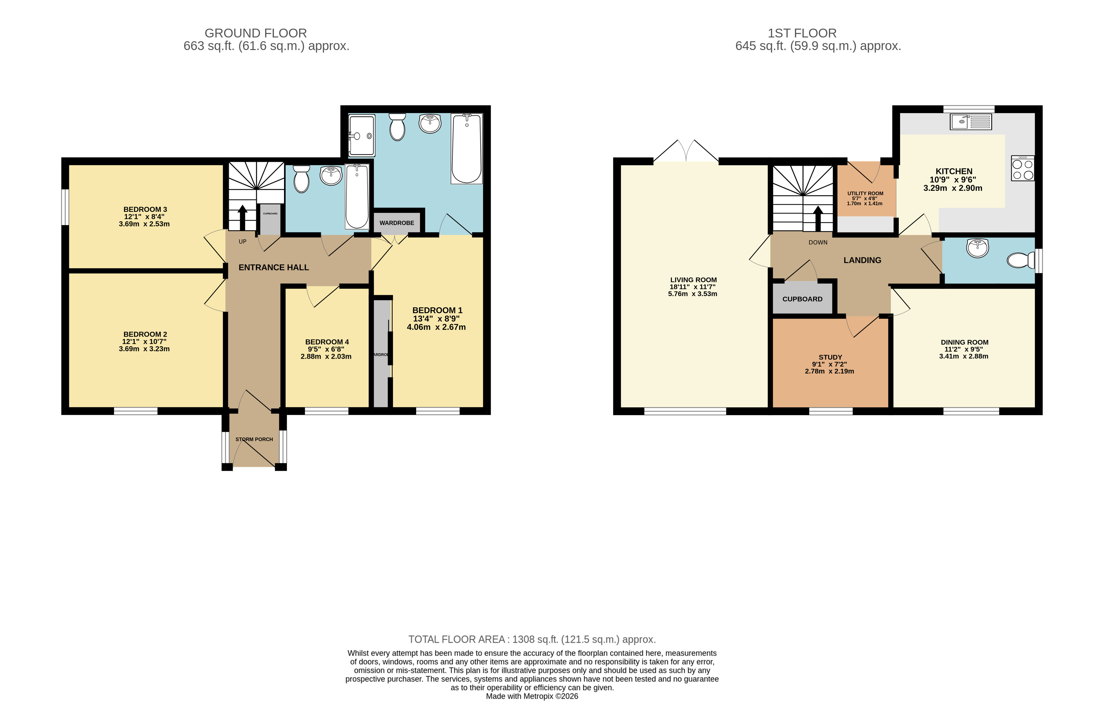 The home is approached via a neat front garden creating an inviting first impression. Enter via the storm porch, a practical space ideal for storing coats and shoes, before stepping through the front door into the entrance hallway. To the left, you will find Bedroom Two, a generously sized double room enjoying a pleasant outlook to the front of the property. Further along is Bedroom Three, a smaller double currently arranged as a twin room, offering flexibility for family living or guests. The hallway then turns to the right, where there is a useful understairs storage cupboard. A door on the right leads to Bedroom Four, a more compact room perfectly suited as a nursery or home office. To the rear of the property lies the principal bedroom, an ample double featuring fitted wardrobes and the benefit of a private en-suite, complete with both a bath and separate shower. This floor is completed by the main family bathroom, fitted with a bath, WC, and hand wash basin. A flight of stairs ascends to the first floor. To the left is the living room, an impressive space spanning the full width of the home, French doors enhance the room, flooding it with natural light and providing direct access to the rear garden. This is the perfect space for relaxing with family or entertaining guests. Returning to the hallway, a door to the right leads to a smaller room overlooking the front, currently arranged as a study, ideal for home working or as a flexible additional room. Further along, the dining room provides a dedicated space for family meals and entertaining. This floor also benefits from a useful cloakroom. A door to the left leads into the kitchen, which is fitted with modern, sleek units and integrated appliances. Positioned at the rear of the property, it enjoys a pleasant outlook over the garden. From the kitchen, there is a small utility area, as well as a rear door leading to the garden.
