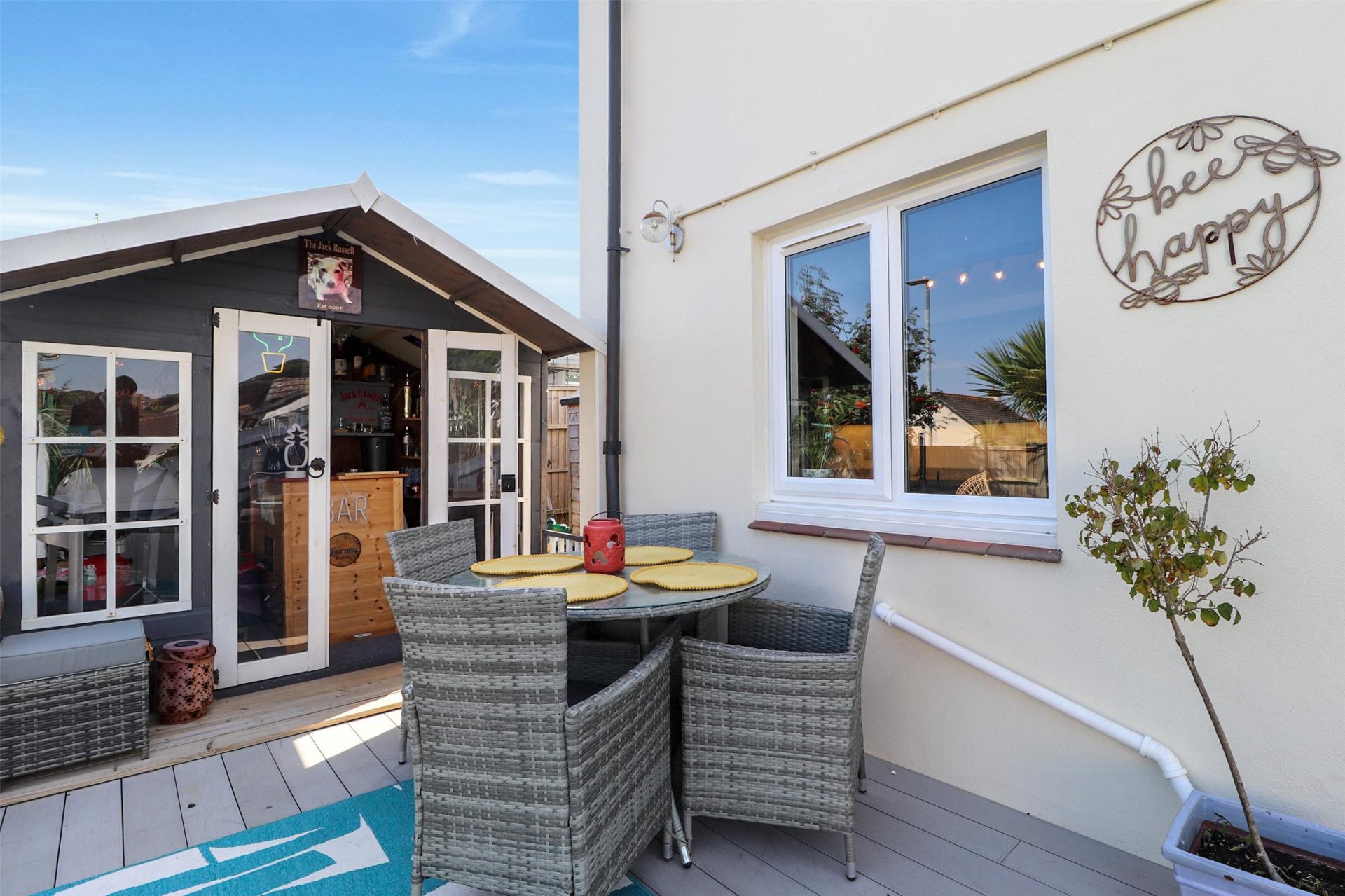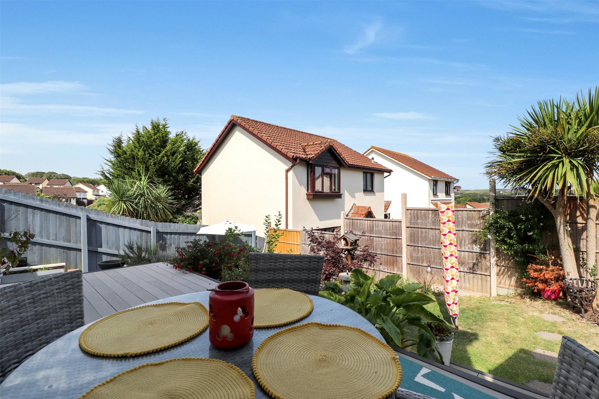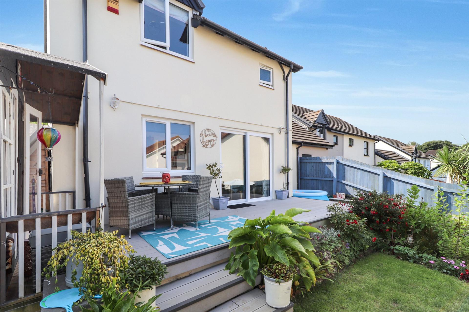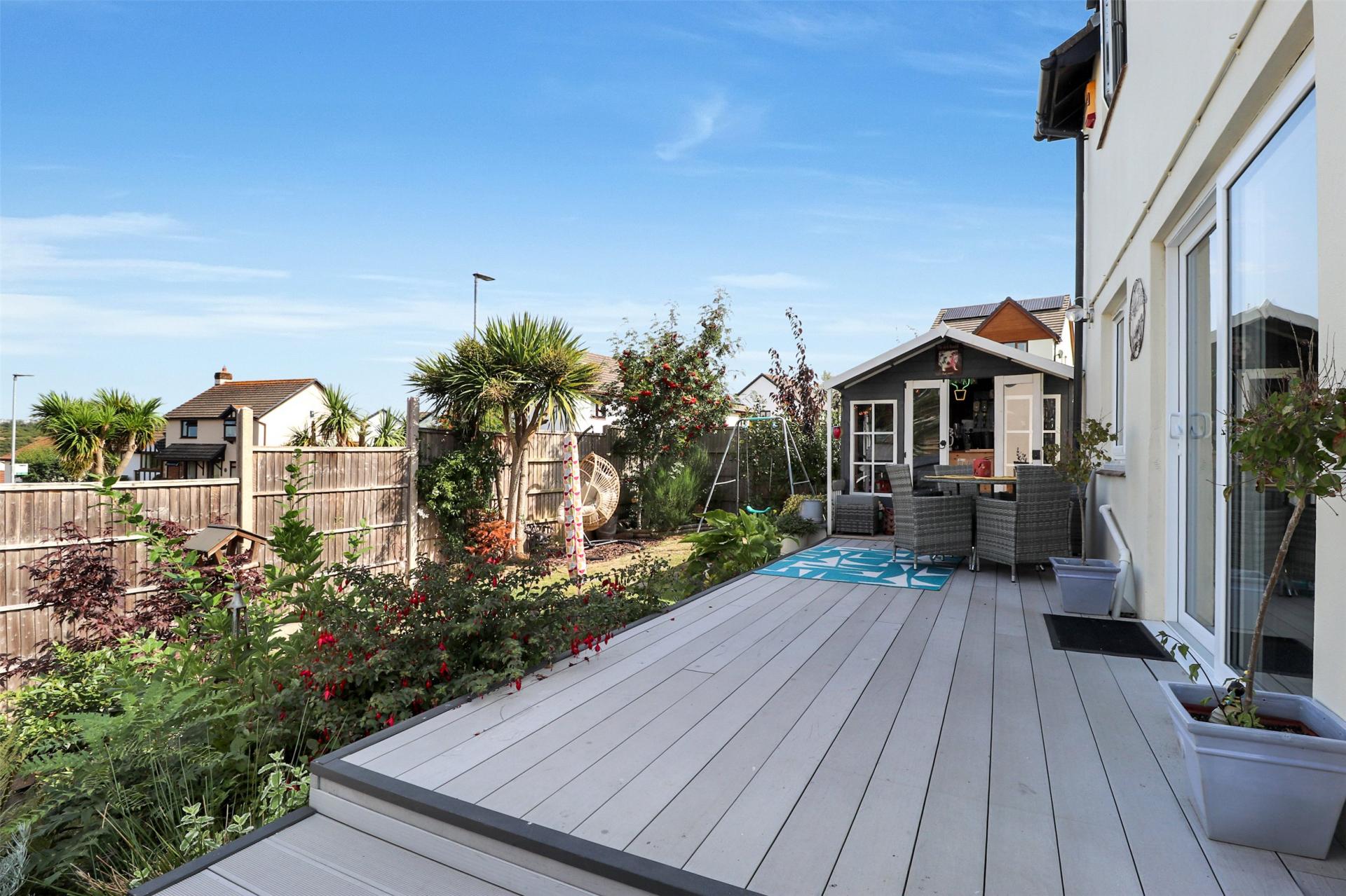 Outside, the rear garden is a real highlight. A composite deck adjoins the house, providing space for outdoor dining while enjoying views over the estate and far-reaching countryside. The garden is landscaped with level lawn, mature shrubs, and trees, and includes a lower, more secluded seating area perfect for relaxing in privacy or enjoying a morning coffee.
