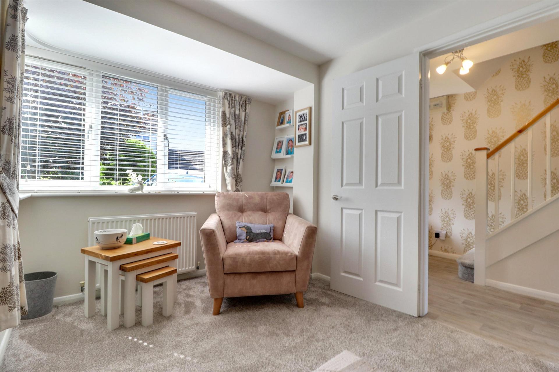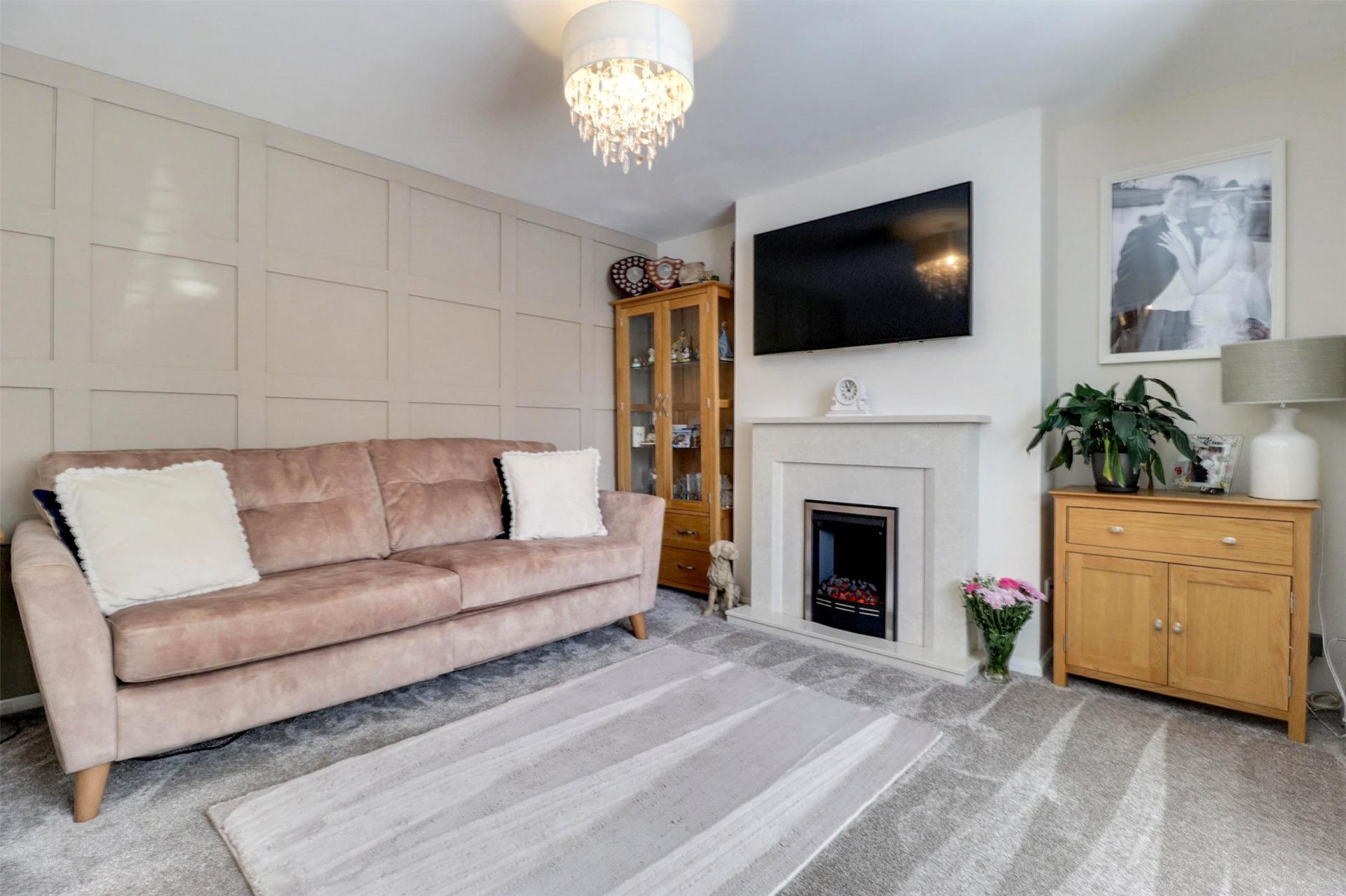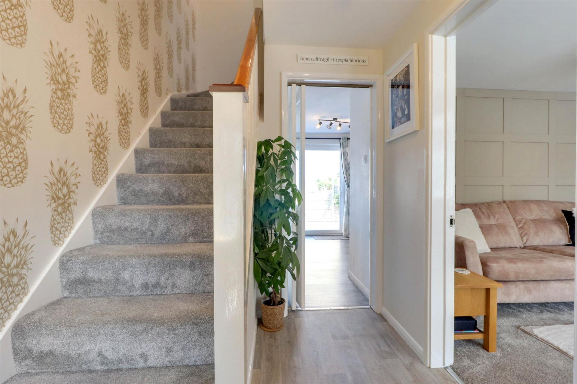 Approaching the property, you are greeted by a driveway with parking for two vehicles leading to the garage (with electric roller shutter) and a low-maintenance front garden. A storm porch leads to the main entrance, opening into a welcoming hallway with doors to the principal rooms and a staircase rising to the first floor.