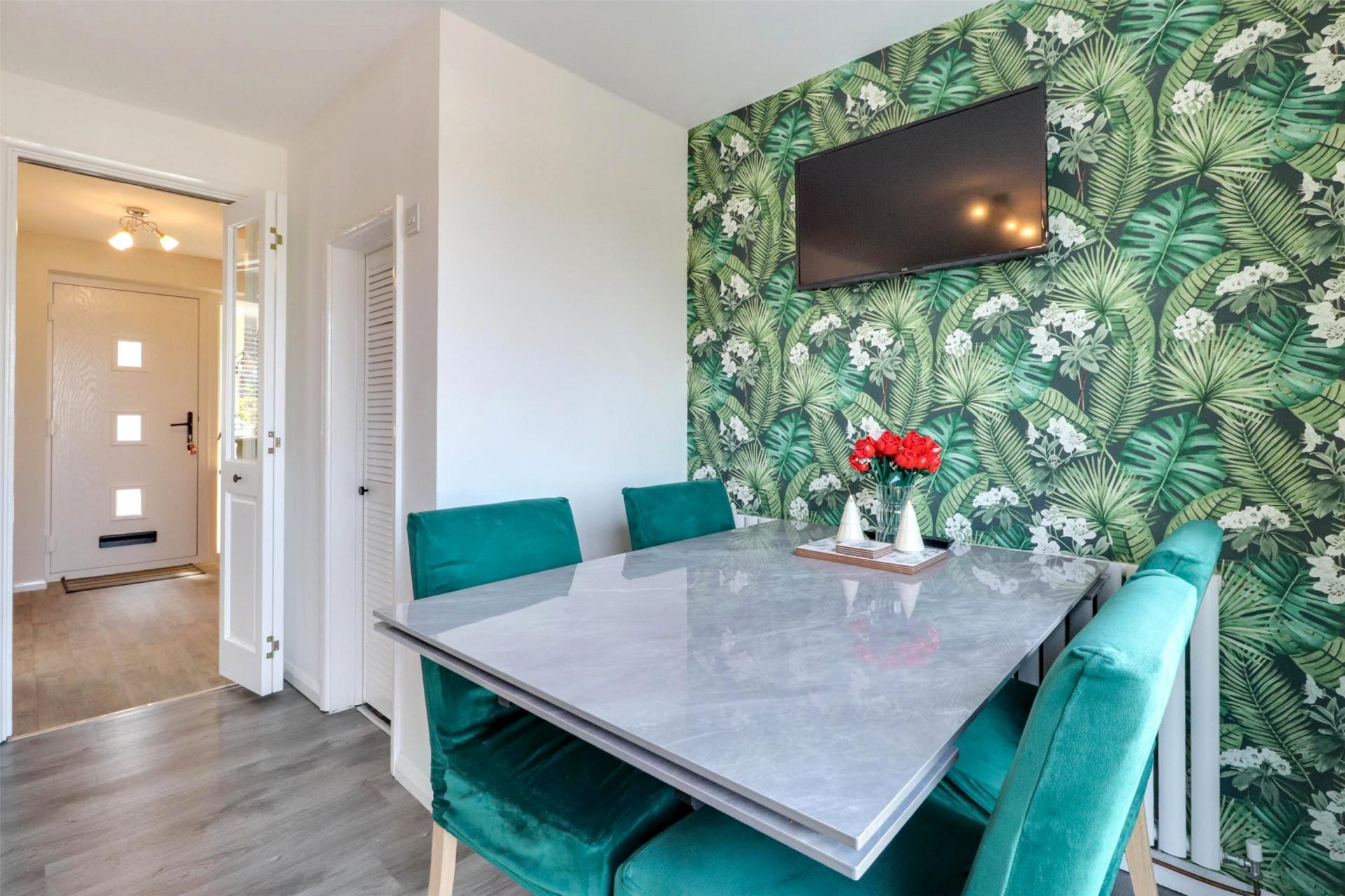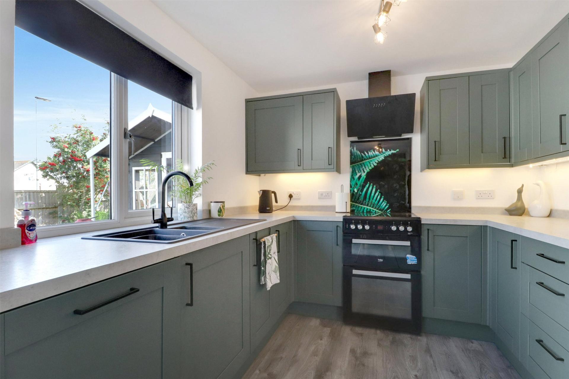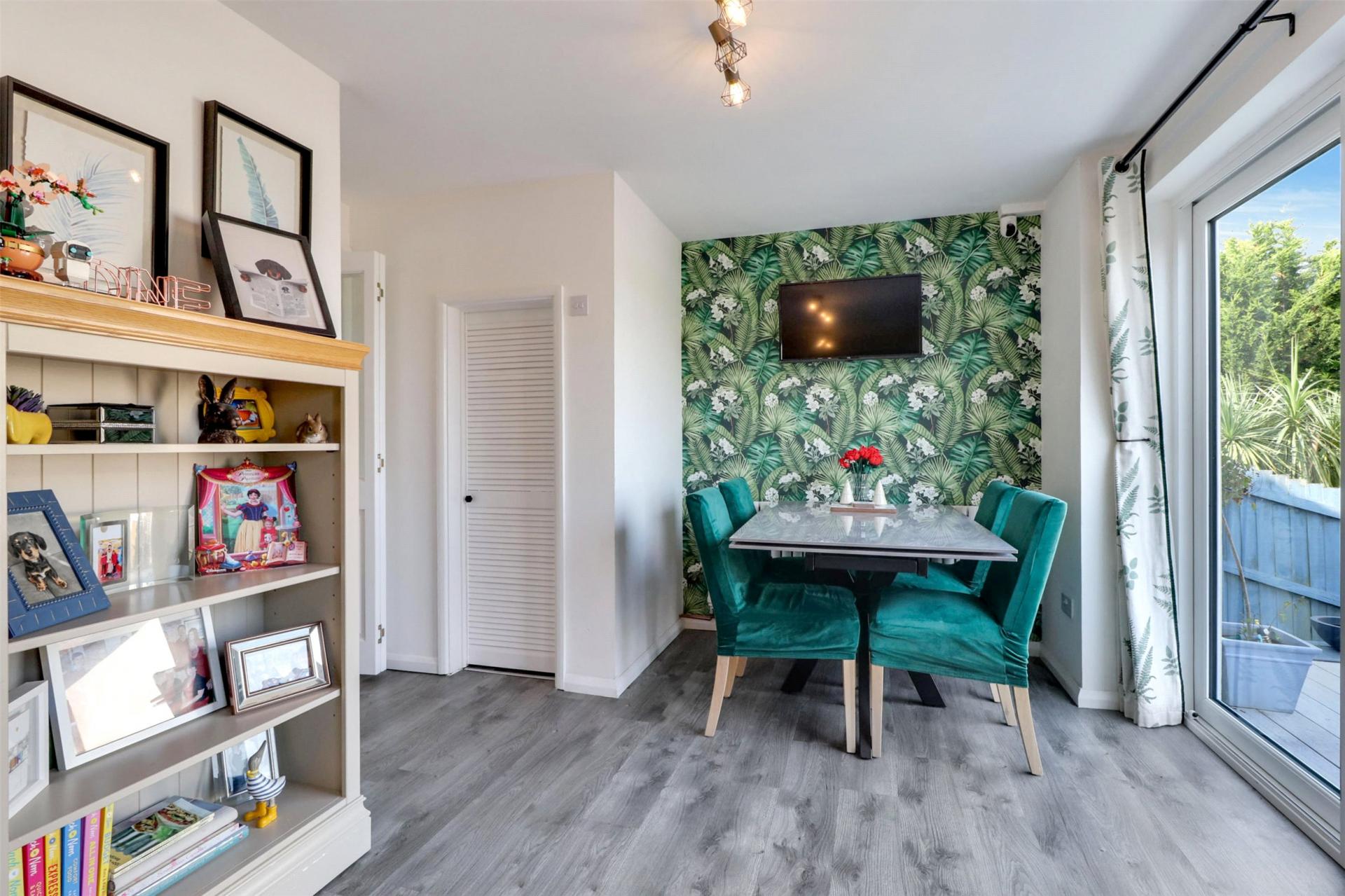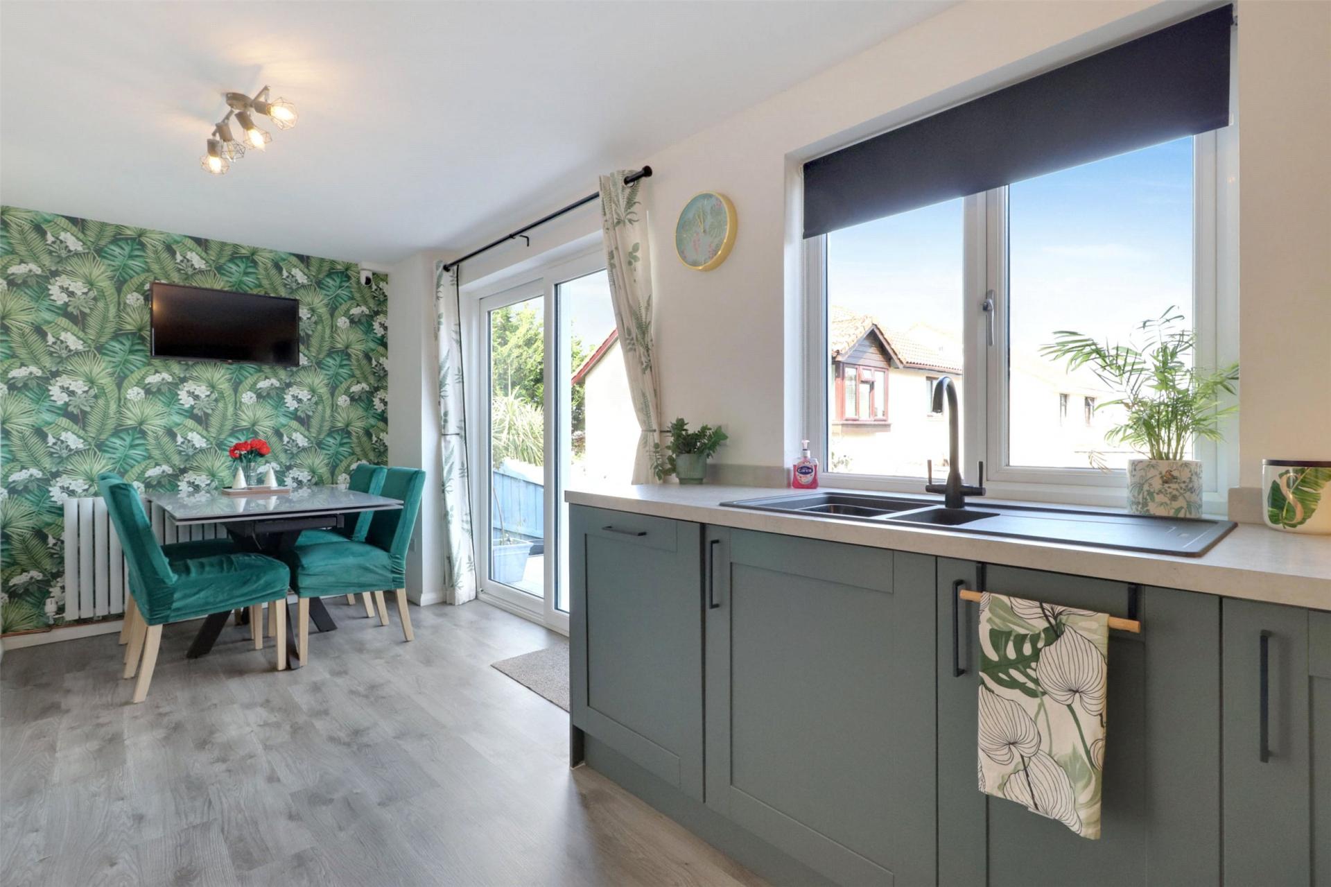 The open-plan kitchen and dining room enjoys views over the rear garden. The dining area provides space for a family table and chairs, with patio doors opening directly onto the garden. The modern fitted kitchen is equipped with an excellent range of eye-level and base units, an integrated dishwasher, and space for a freestanding cooker and fridge/freezer.