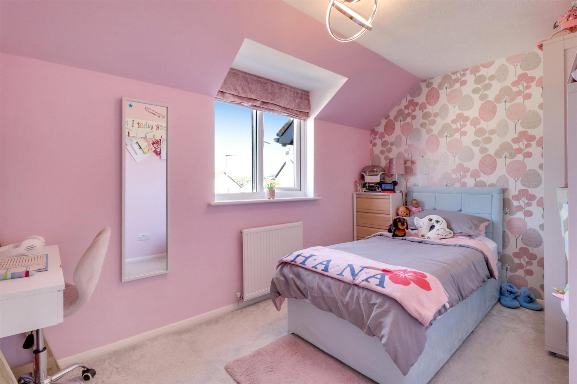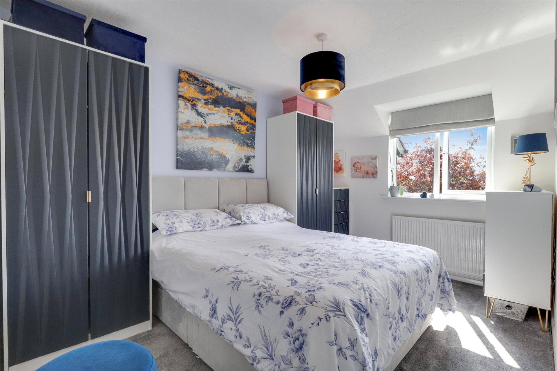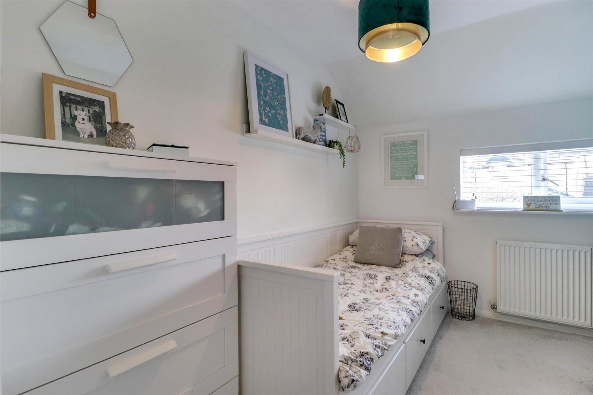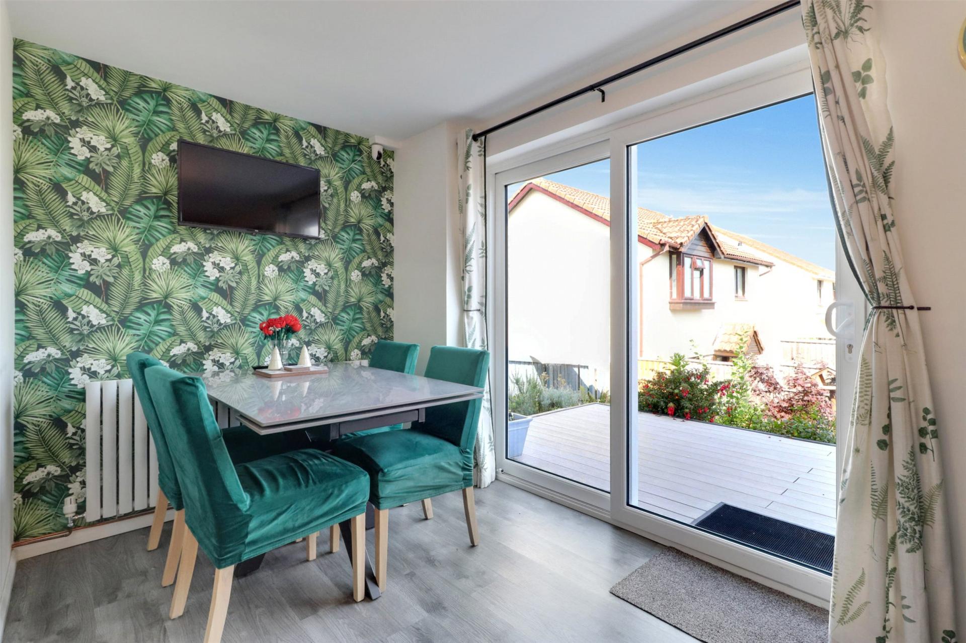The open-plan kitchen and dining room enjoys views over the rear garden. The dining area provides space for a family table and chairs, with patio doors opening directly onto the garden. The modern fitted kitchen is equipped with an excellent range of eye-level and base units, an integrated dishwasher, and space for a freestanding cooker and fridge/freezer.