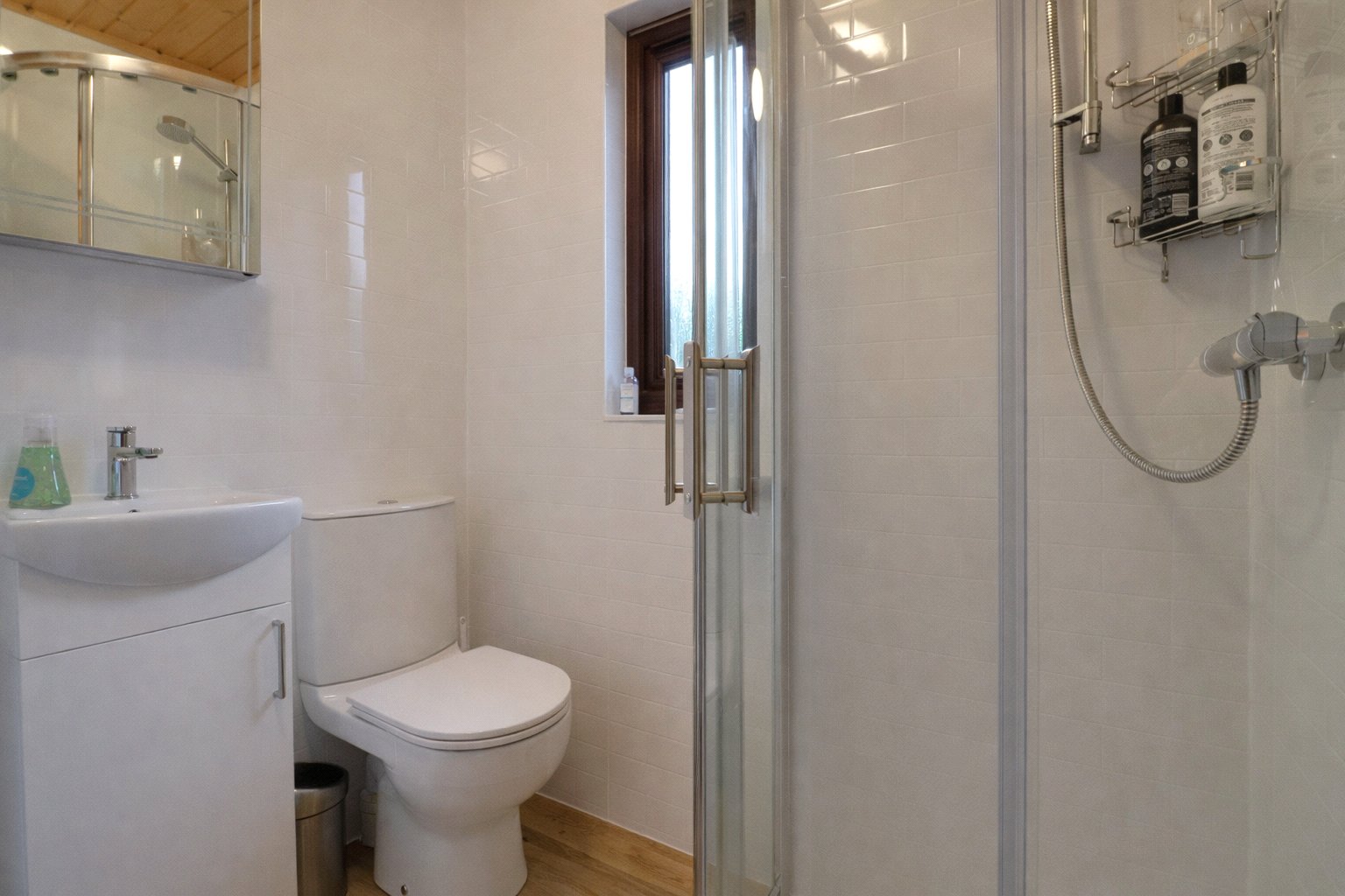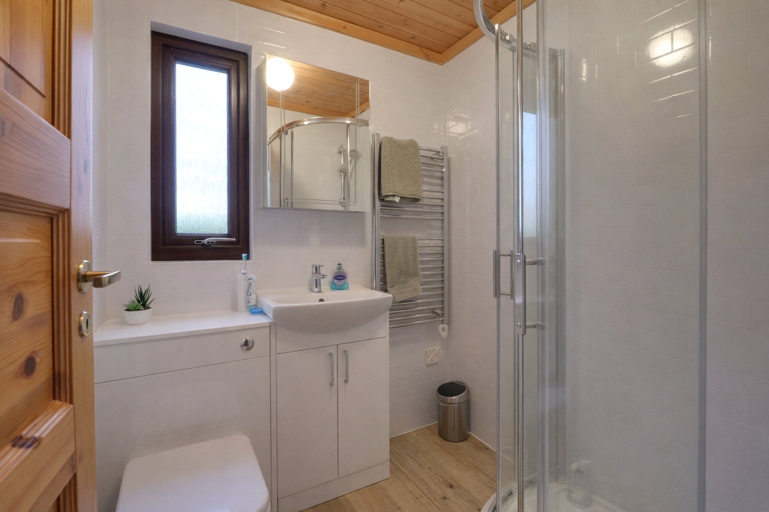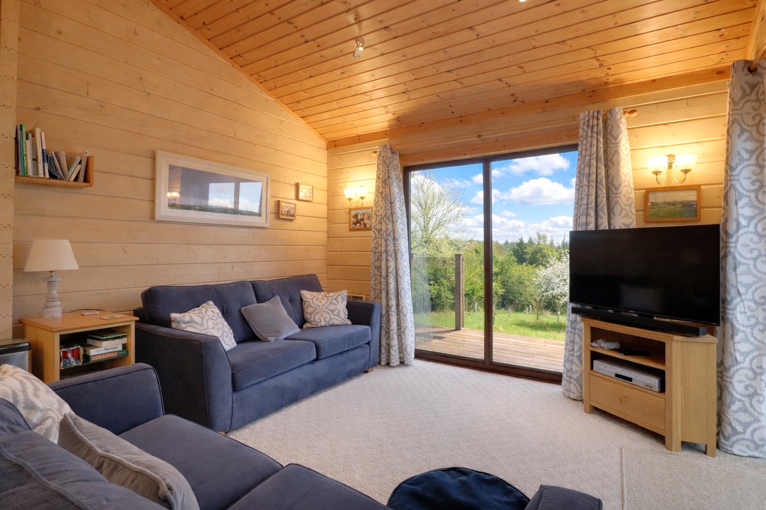 Stepping through the front door and into the hallway sets the scene for a wooden retreat. Turning right from the hallway welcomes you seamlessly into the open plan living space with high vaulted ceilings. There is a fitted kitchen with ample space for white goods and a dining area benefitting from large windows to soak in the beautiful surrounding countryside views. The living area, with an abundance of natural light makes a great place for relaxing and a large sliding door allows you to step out onto the decking area and outside space, a perfect hosting area for those warm summer evenings.