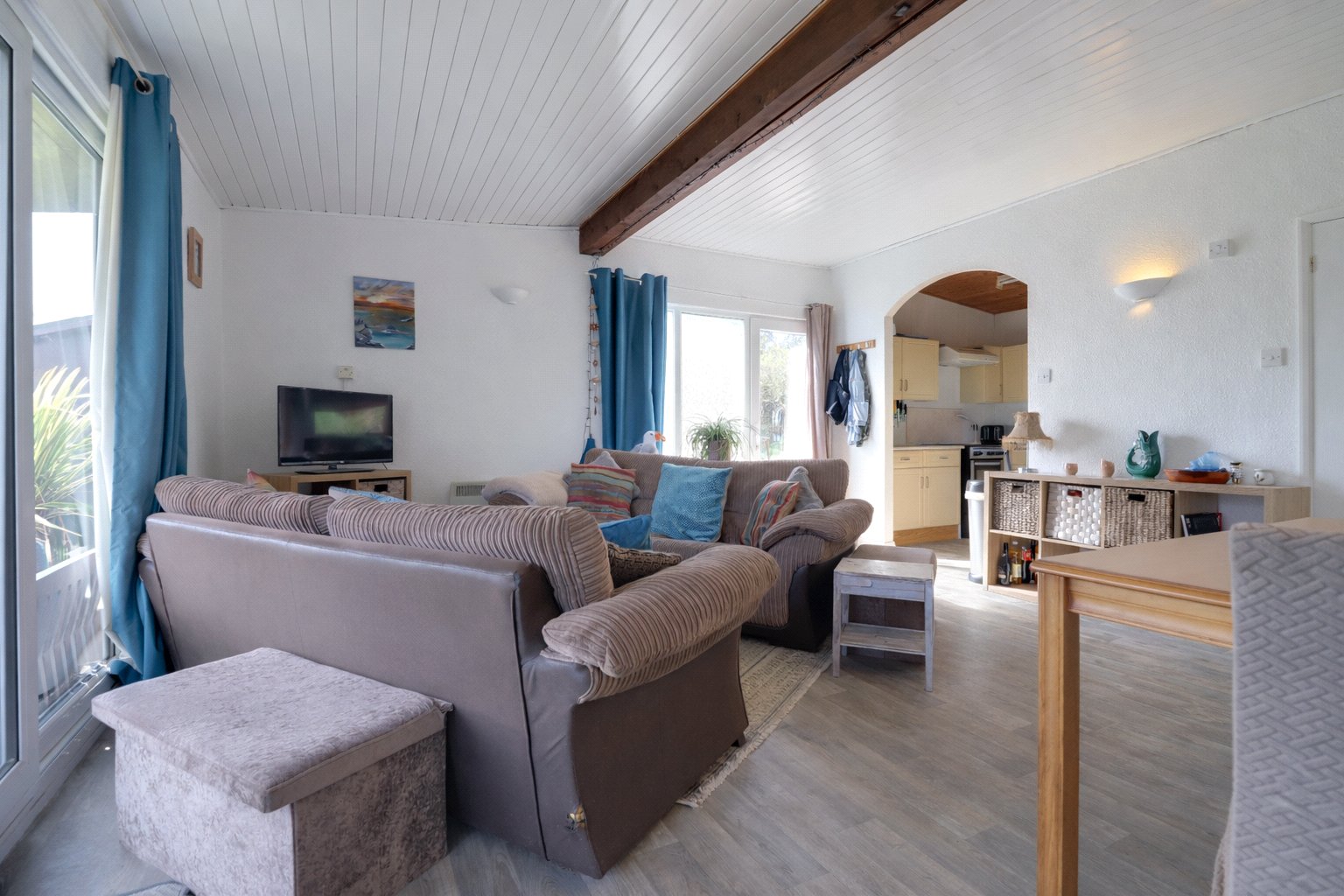 Entering inside you are welcomed in to the large open plan living space. To the left is the well-appointed kitchen, featuring a range of wall and base units with ample worktop space. Fully equipped for self-catering stays, the kitchen includes an oven, hob, extractor, and space for essential appliances, making it ideal for both short breaks and longer visits. Onto a spacious open-plan living and dining area. Bathed in natural light from multiple large windows and patio doors, this inviting space creates a seamless connection between indoors and out. A comfortable seating area provides the perfect place to unwind, while the dining area is ideal for entertaining or family meals. Sliding doors open directly onto the decking. The bathroom is neatly arranged and features a full-sized bath with shower attachment, wash basin, and WC.