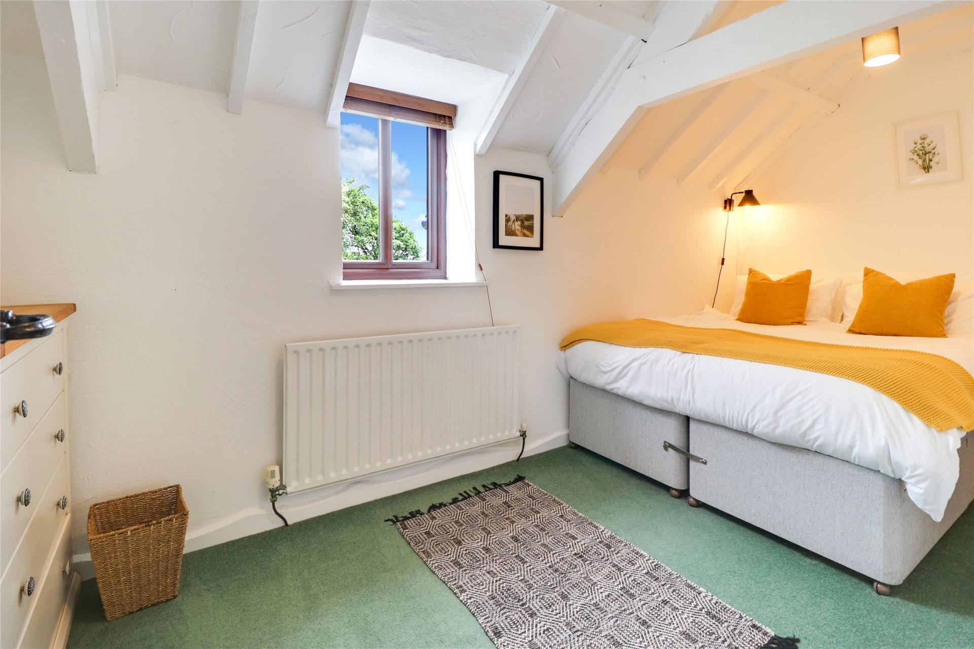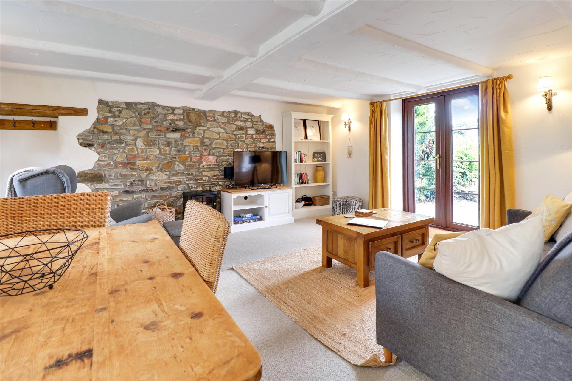 The living area offers charming exposed stone walls, with French doors to the rear garden and far-reaching countryside views.