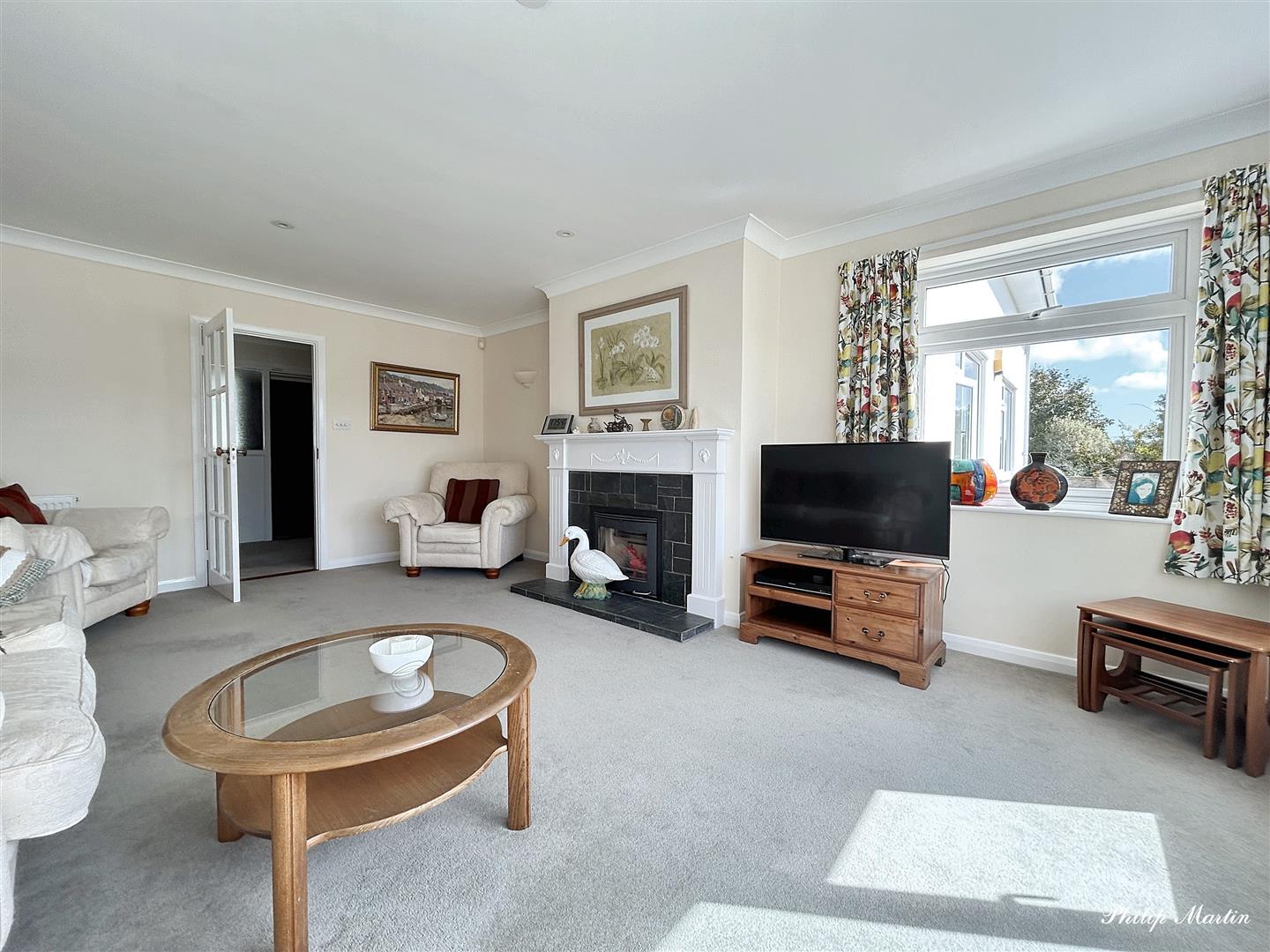 Sitting Room - 4.80m x 4.60m (15'8" x 15'1") - A light, well proportioned room with picture window enjoying fabulous views over the river with the Carclew woods beyond and window to side with views of the garden and creek. Feature fireplace with wooden surround incorporating wood burning stove with a slate hearth. Radiator, two telephone points, wall lights.