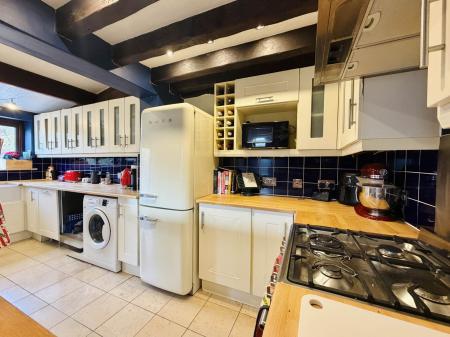 The kitchen is thoughtfully designed in a Shaker style, complete with a classic butler sink and quality fittings, flowing naturally into a bright and airy dining area. Here, French doors open onto a thoughtfully landscaped, low-maintenance garden, ideal for both relaxed outdoor living and entertaining, while also providing access to the single garage.