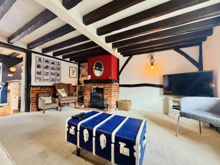 The principal reception room is a standout feature: a generous sitting room rich in atmosphere, showcasing exposed brickwork, original beams, and a striking wood-burning stove, creating a wonderfully inviting focal point.