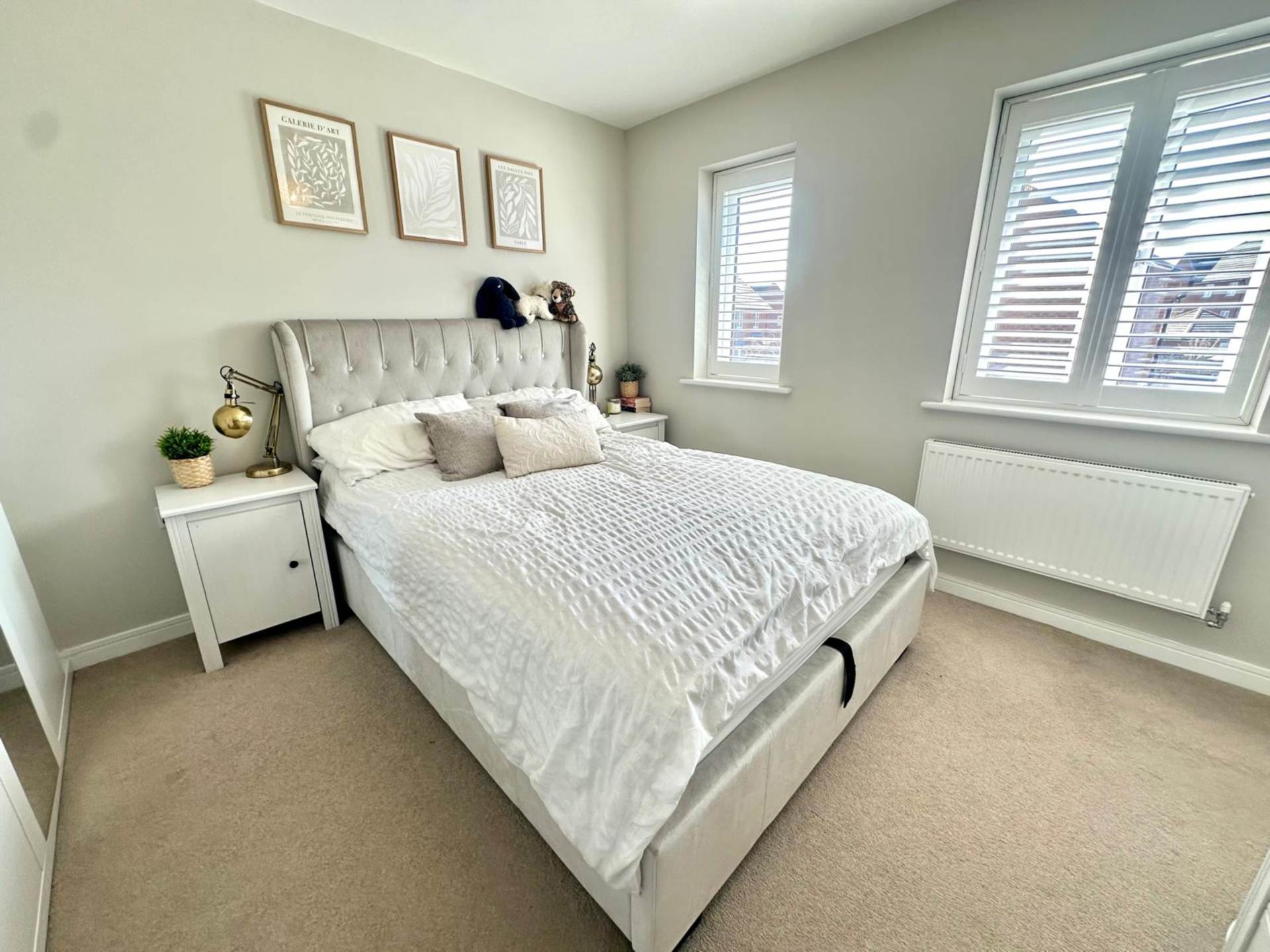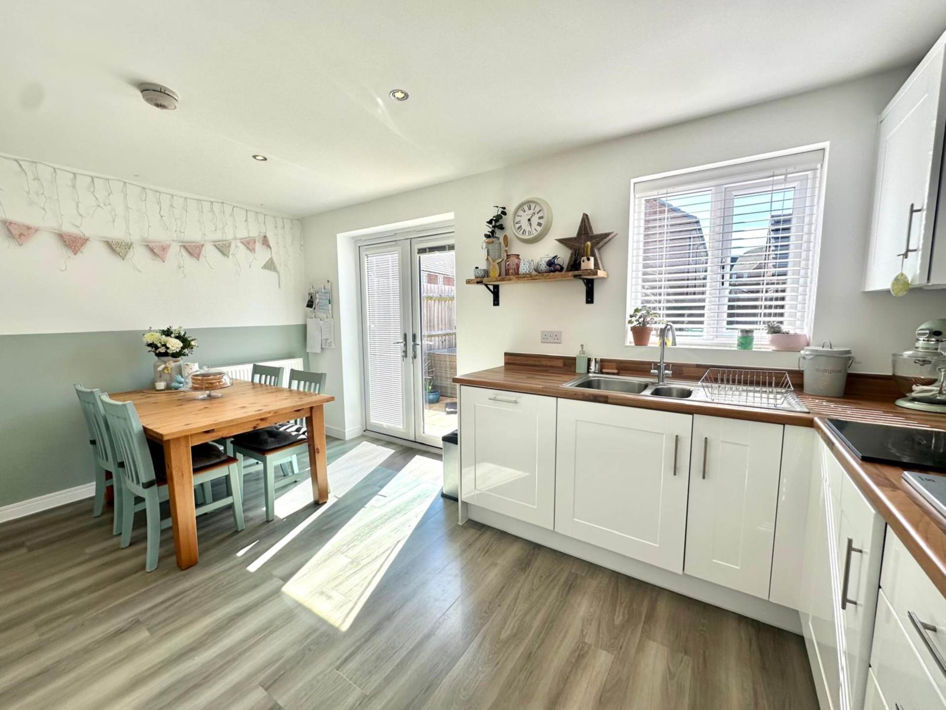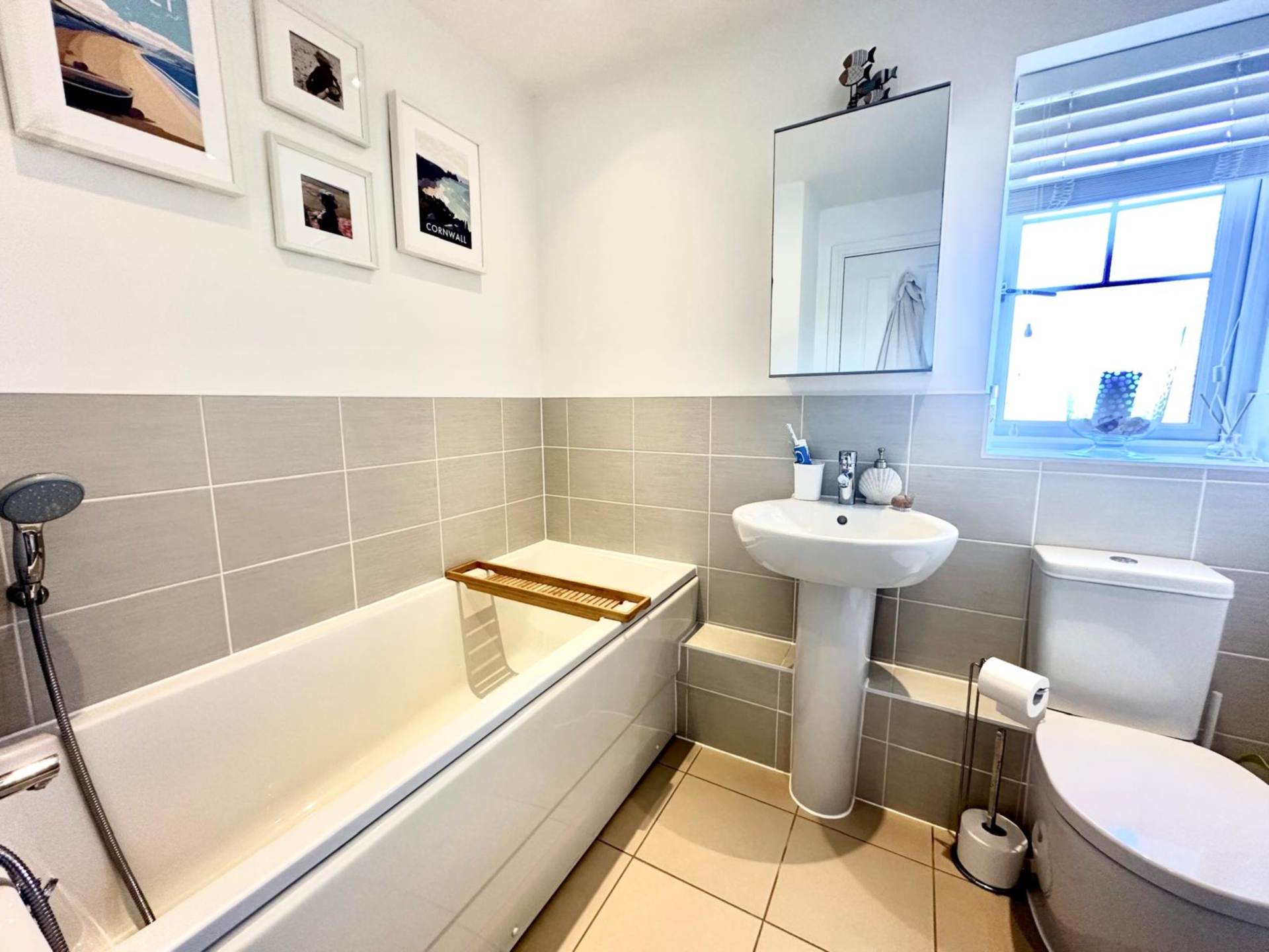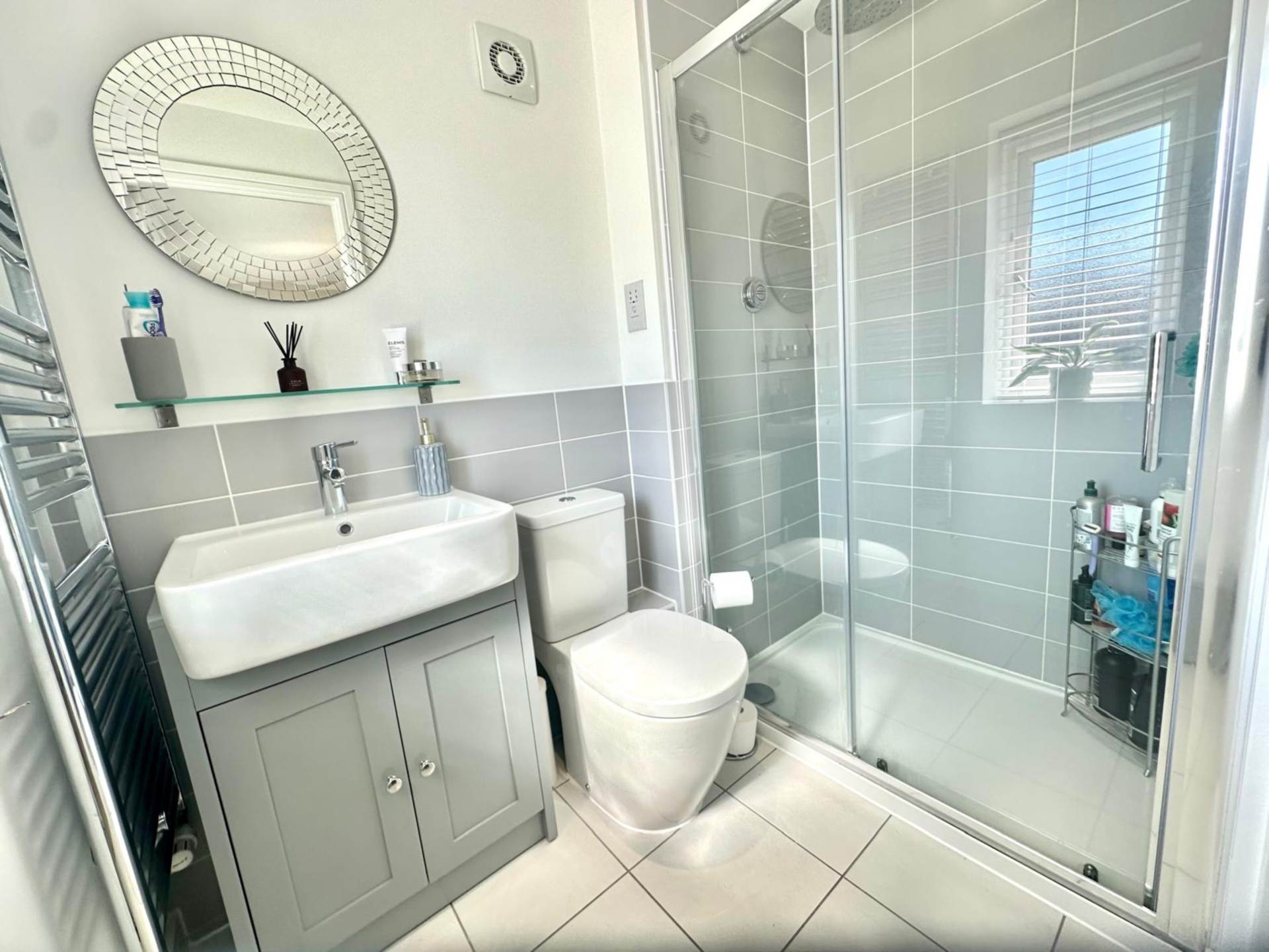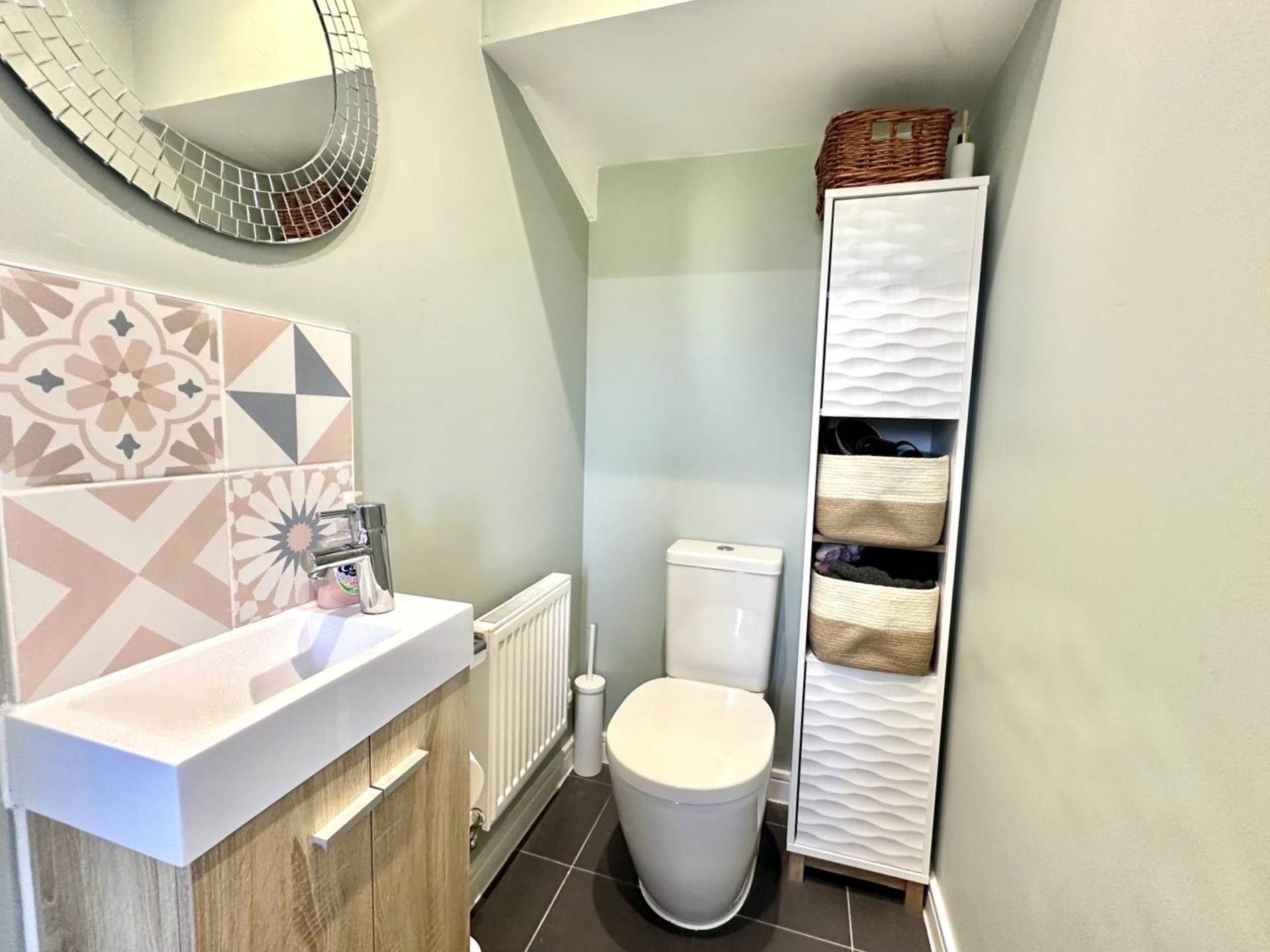 The property comprises of an entrance hall, cloakroom, living room with bay window, modern fitted kitchen/dining room with integrated appliances and French doors leading to the southerly facing rear. The first floor offers a master bedroom with a built-in wardrobe, en-suite shower room with modern fitted suite comprising of a shower cubicle, toilet and basin then a further two bedrooms, one double and a good single (currently set up as a home office). The bathroom is modern with a fitted suite comprising bath, toilet and basin.