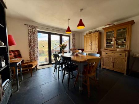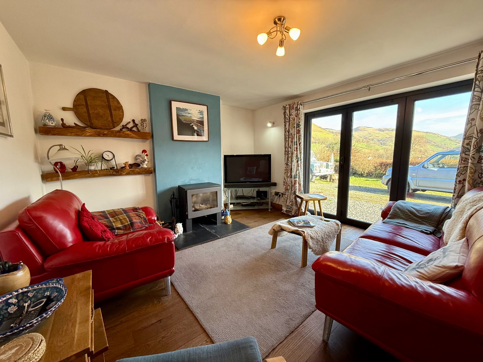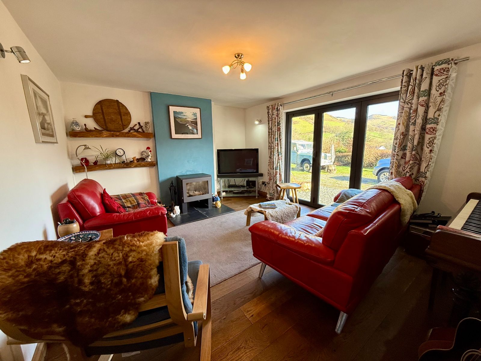 Bi-fold doors to front with valley and mountain views, free standing multi-fuel stove on a slate hearth, wall lights, radiator, engineered oak flooring.