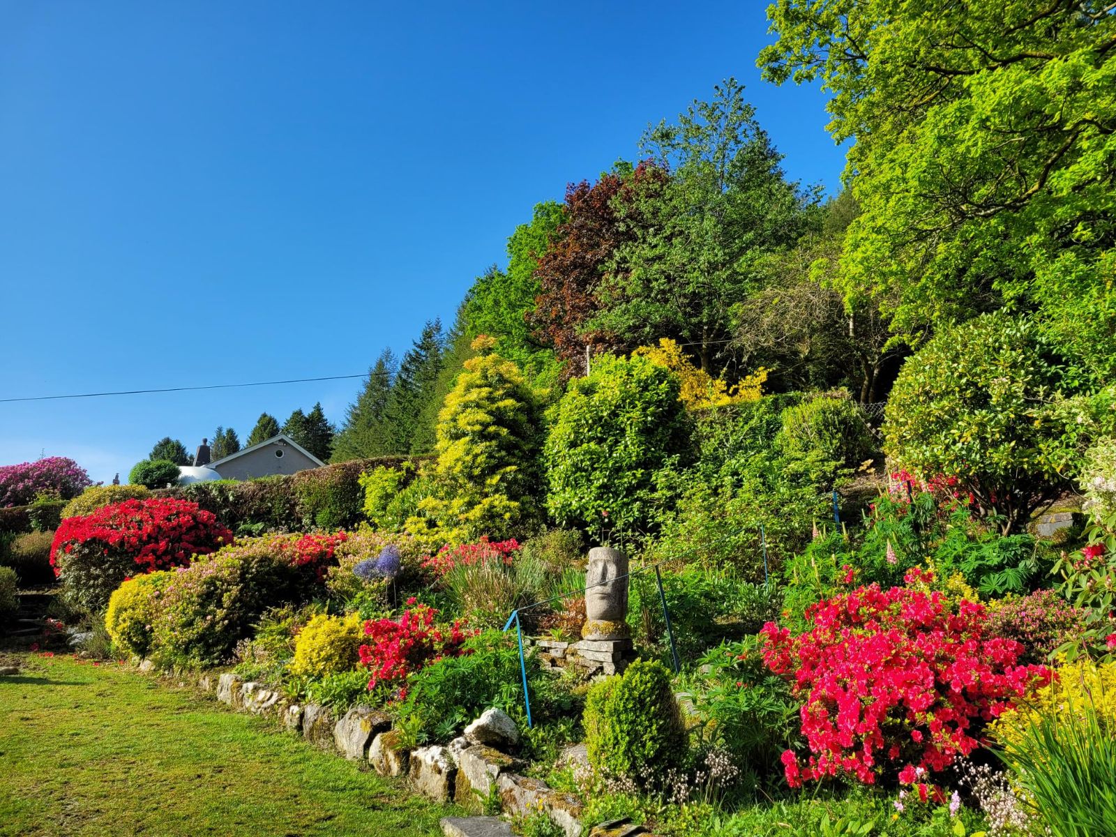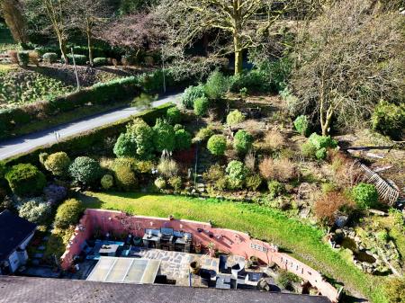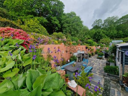 The gardens are terraced with a lawned area, with steps rising to the upper parts of the garden with seating area commanding excellent views across the valley and mountains in the distance. There is a useful gateway at the top of the garden leading out to the road.