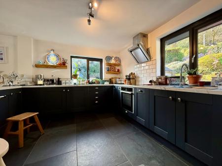 Window to rear, large larder unit, 11 base units, to include integral fridge and freezer and dishwasher, under a marble effect worktop, tiled splash backs, 11/4 stainless steel sink and drainer, Neff pyrolytic integral oven and induction hob with extractor fan above, open chimney breast housing Rayburn, oak shelves, radiator, slate flagged floor.