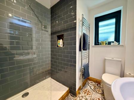 Window to rear, large shower cubicle with mains shower, ceiling downlights, low level W.C., pedestal wash hand basin with mirror and light above, heated towel rail/radiator, tiled floor.