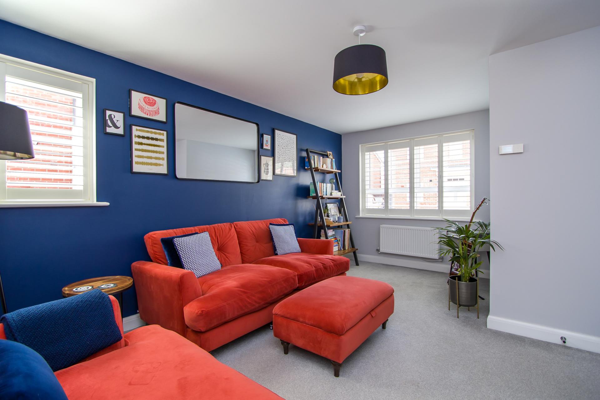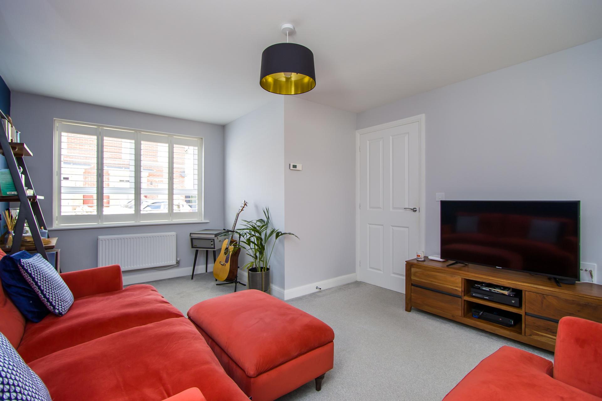 A dual aspect room with uPVC double glazed windows to the front and side, both with fitted shutters. Fitted carpet. Power points and TV point. Central heating radiator. Door to the kitchen.