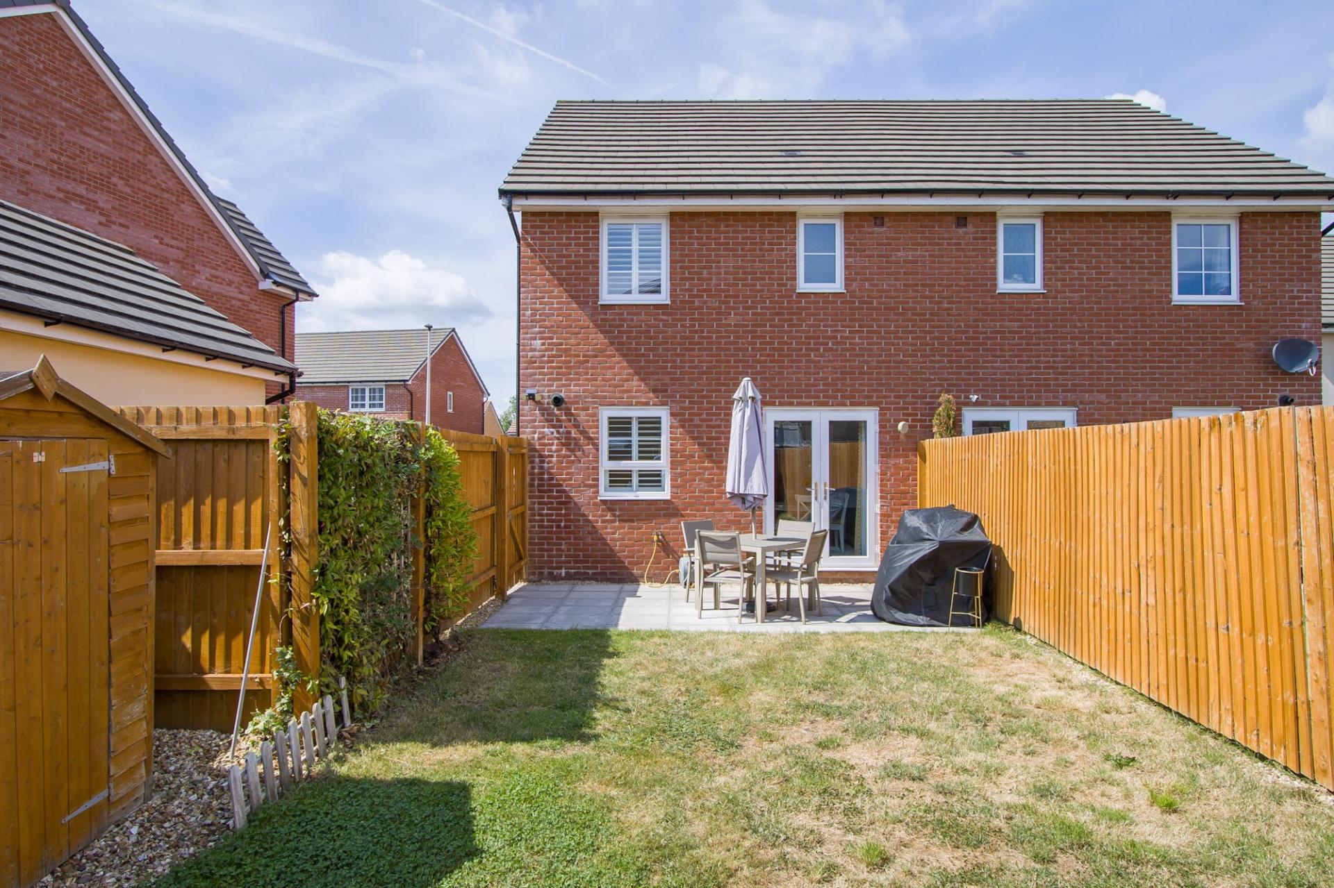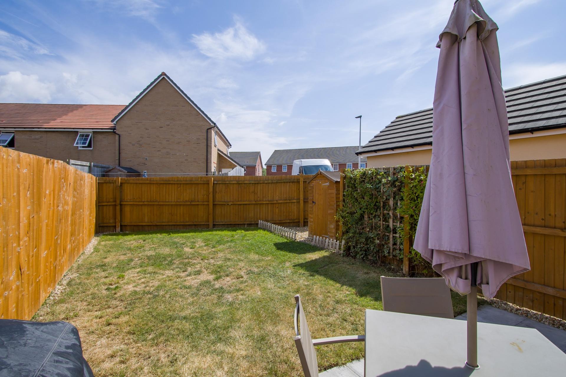 An enclosed rear garden with southerly aspect. Low maintenance and laid to patio and lawn along with an additional area to stone chippings that houses a timber shed. Outside tap and light.