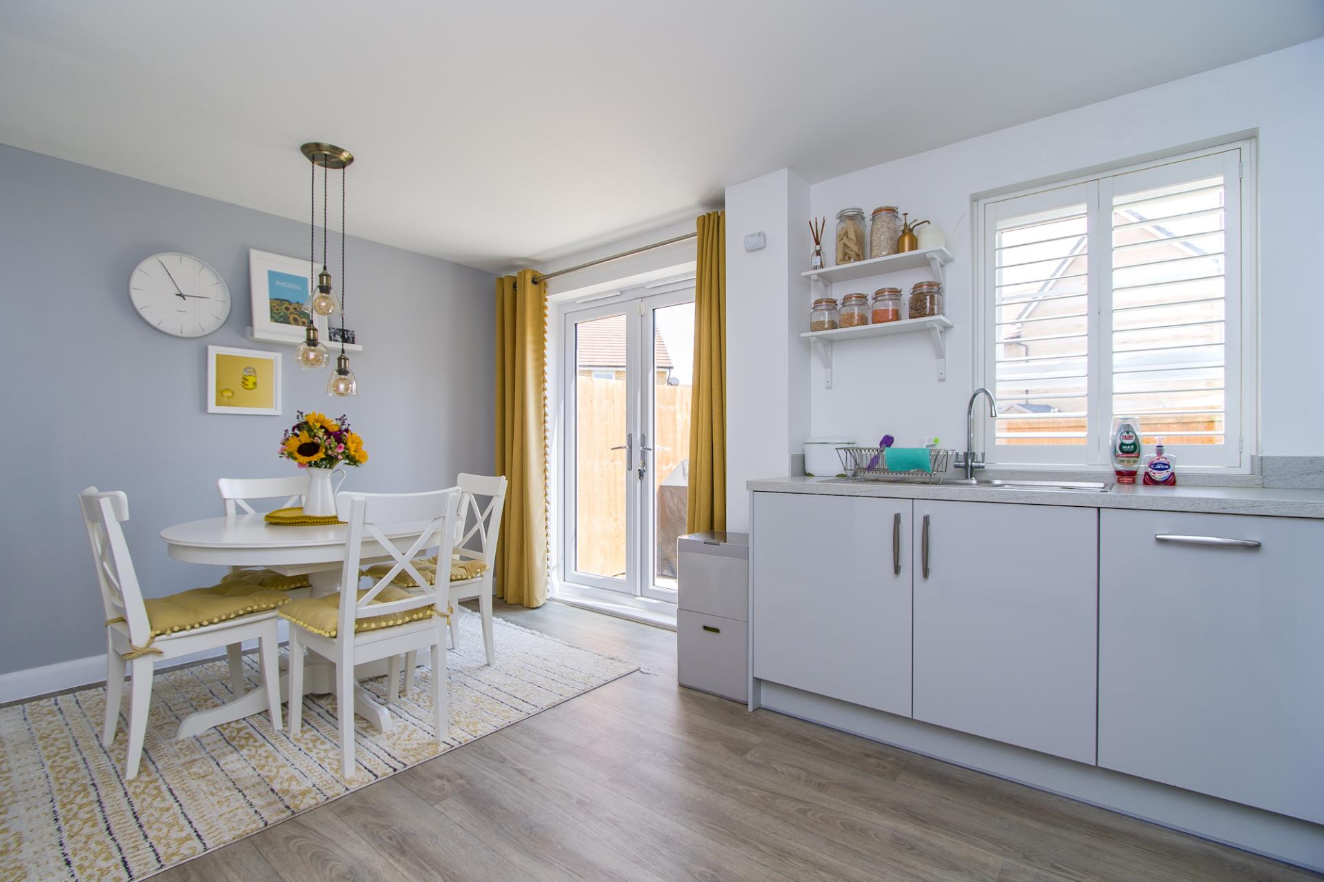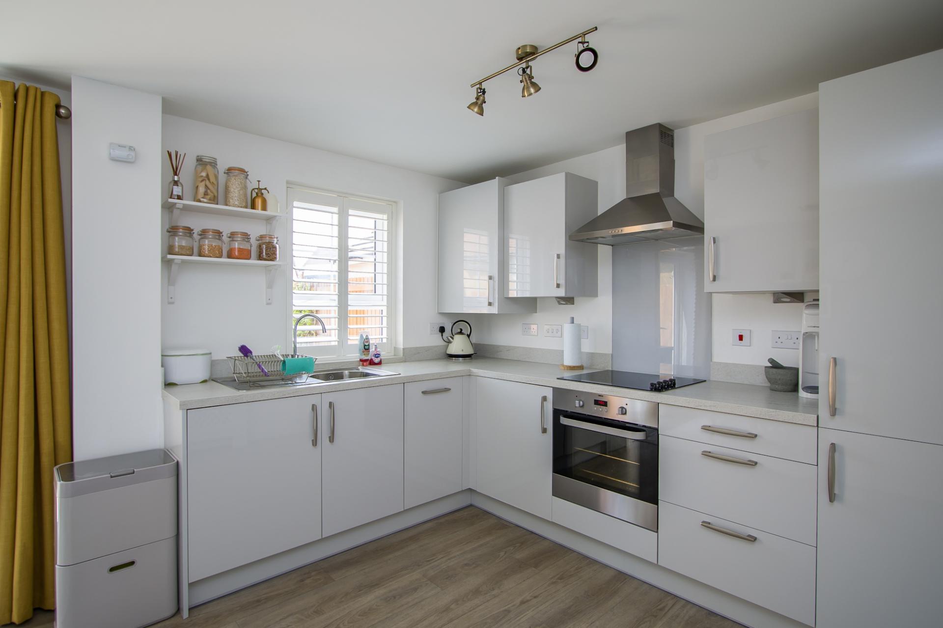 A well-proportioned kitchen with dining space, to the rear of the house overlooking the garden. Vinyl floor. Fitted kitchen comprising wall units and base units with gloss doors and quartz effect laminate work surfaces. Integrated appliances including an electric oven, four zone electric hob, fridge freezer, dishwasher and washing machine. Single bowl stainless steel sink with drainer. Central heating radiator with cover. uPVC double glazed window to the rear with fitted shutters. uPVC double glazed doors giving access into the garden. Under stair cupboard.