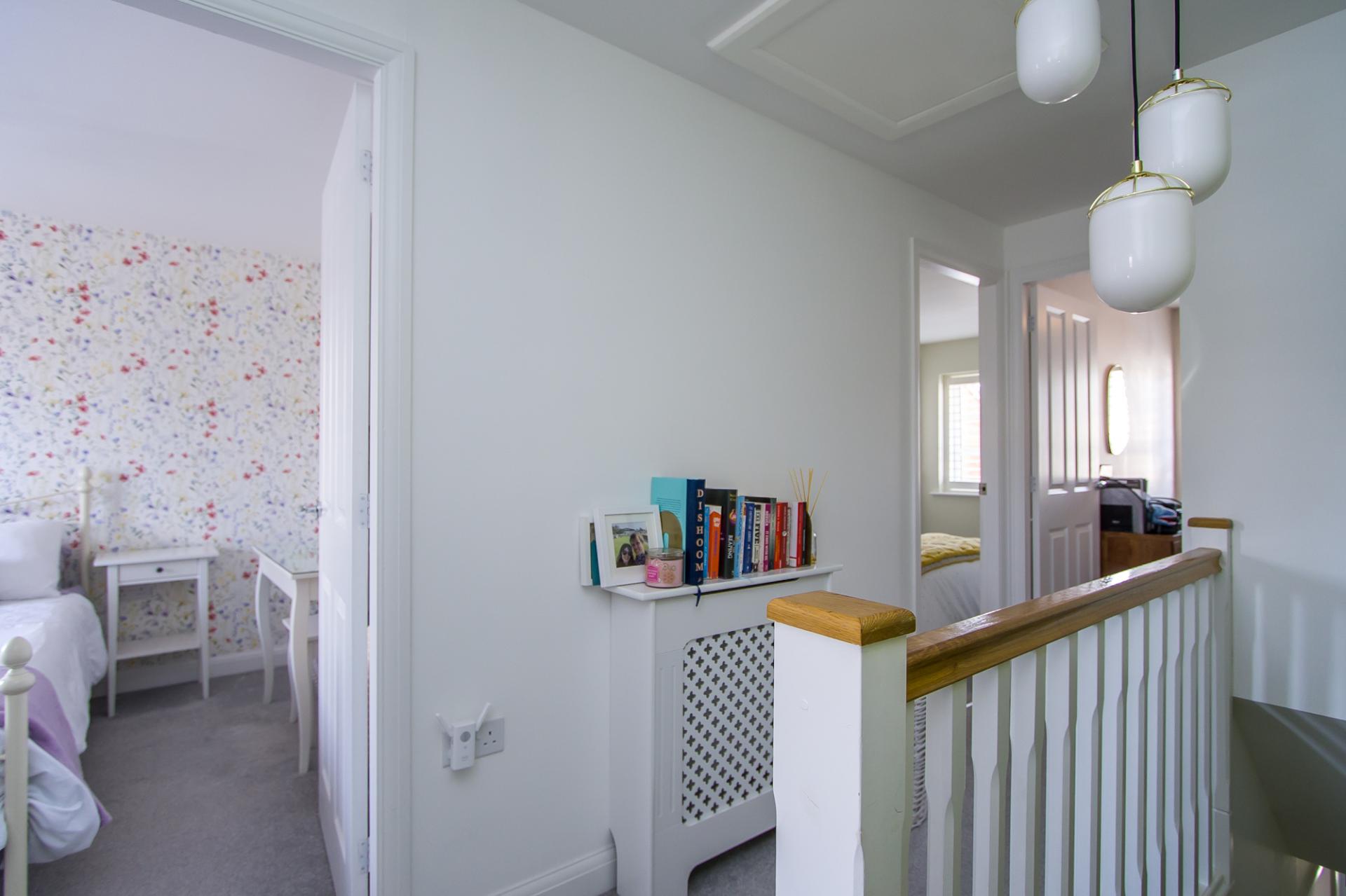 Fitted carpet to the stairs and landing. Central heating radiator with cover. Power points. Doors to all three bedrooms and the bathroom. Hatch to the loft space.