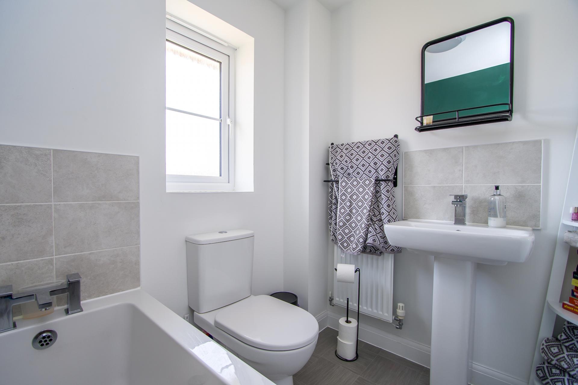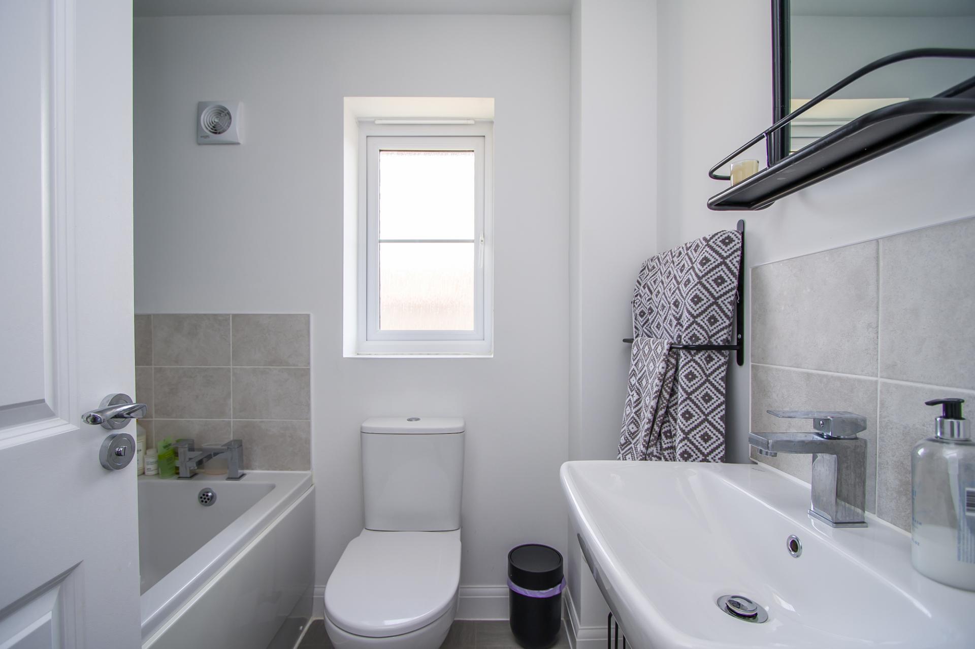 Vinyl floor. Suite comprising a panelled bath, a WC and a sink. Extractor fan. Central heating radiator. uPVC double glazed window to the rear.