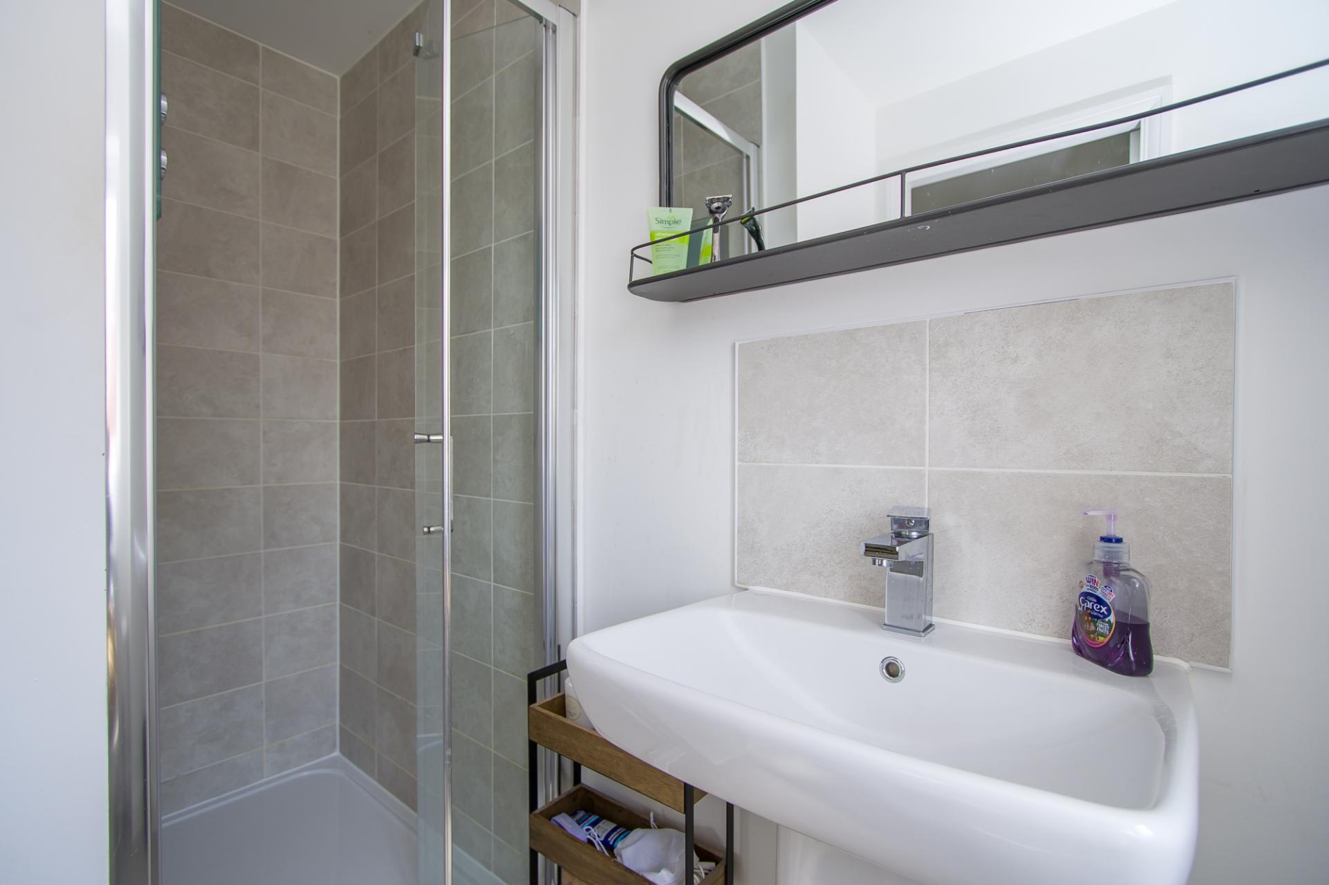 uPVC double glazed window to the side. Vinyl floor. Suite comprising a shower cubicle with mixer shower, WC and sink. Extractor fan. Shaver point. Central heating radiator.