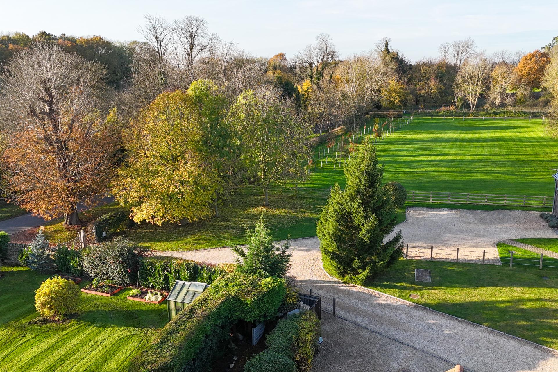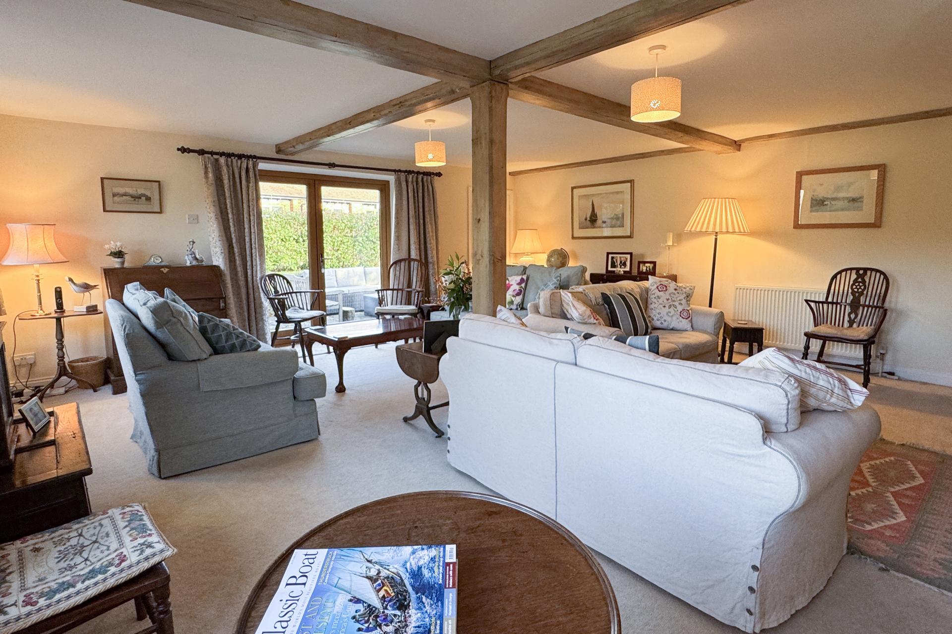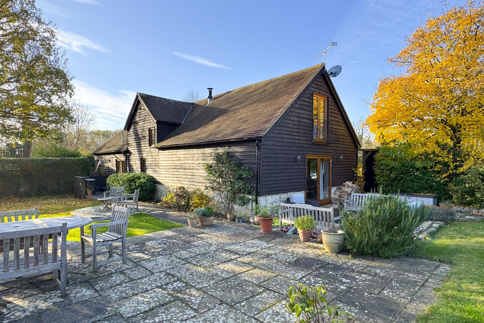 Outside, the barn is accessed via secure electric timber gates, offering ample off-street parking. The front garden provides a delightful outlook over paddock land, while the rear garden is private and mainly laid to lawn, complemented by vibrant flower and shrub borders. A large, paved terrace to the side is ideal for outdoor entertaining.