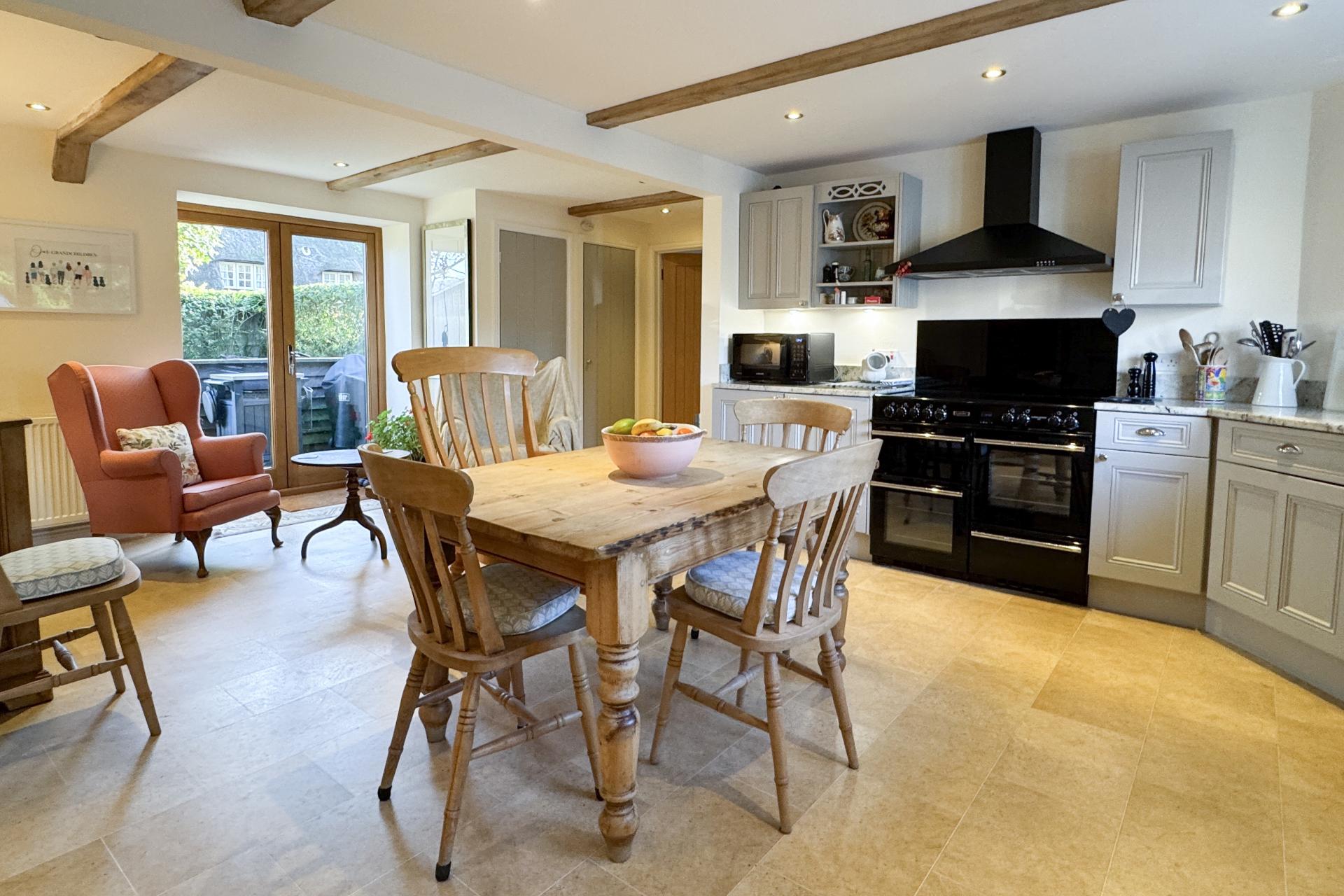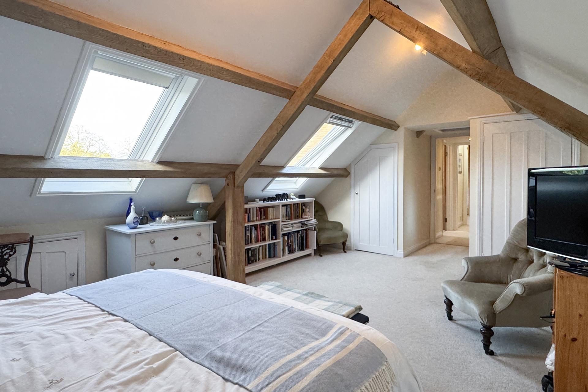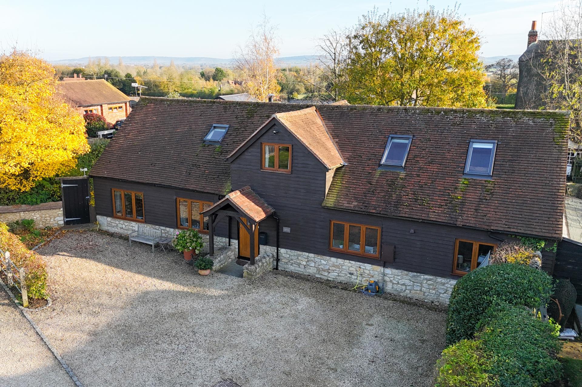 This stunning barn conversion is part of a gated development of just five exclusive homes, situated on the outskirts of the picturesque Buckinghamshire village of Dinton. Combining the timeless charm of traditional barn architecture with contemporary design, this property offers a rare opportunity to enjoy rural tranquility with excellent accessibility. The village centre is a short stroll away, with local amenities including a primary school. For commuters, Haddenham & Thame Parkway station is nearby, providing fast trains to London Marylebone in under 40 minutes. The barn’s flexible living spaces are thoughtfully designed and beautifully presented. The ground floor features a spacious and light-filled reception room, enhanced by a cosy wood-burning stove, creating an inviting atmosphere perfect for relaxing evenings. The large open-plan kitchen and dining area is a highlight, offering grey-painted cabinetry with chrome hardware, expansive granite work surfaces, and a Belfast sink. Integrated appliances include a fridge/freezer and a range cooker with dual ovens and a ceramic hob. The ground floor also includes a modern shower room and a versatile room that could serve as a study or fourth bedroom.