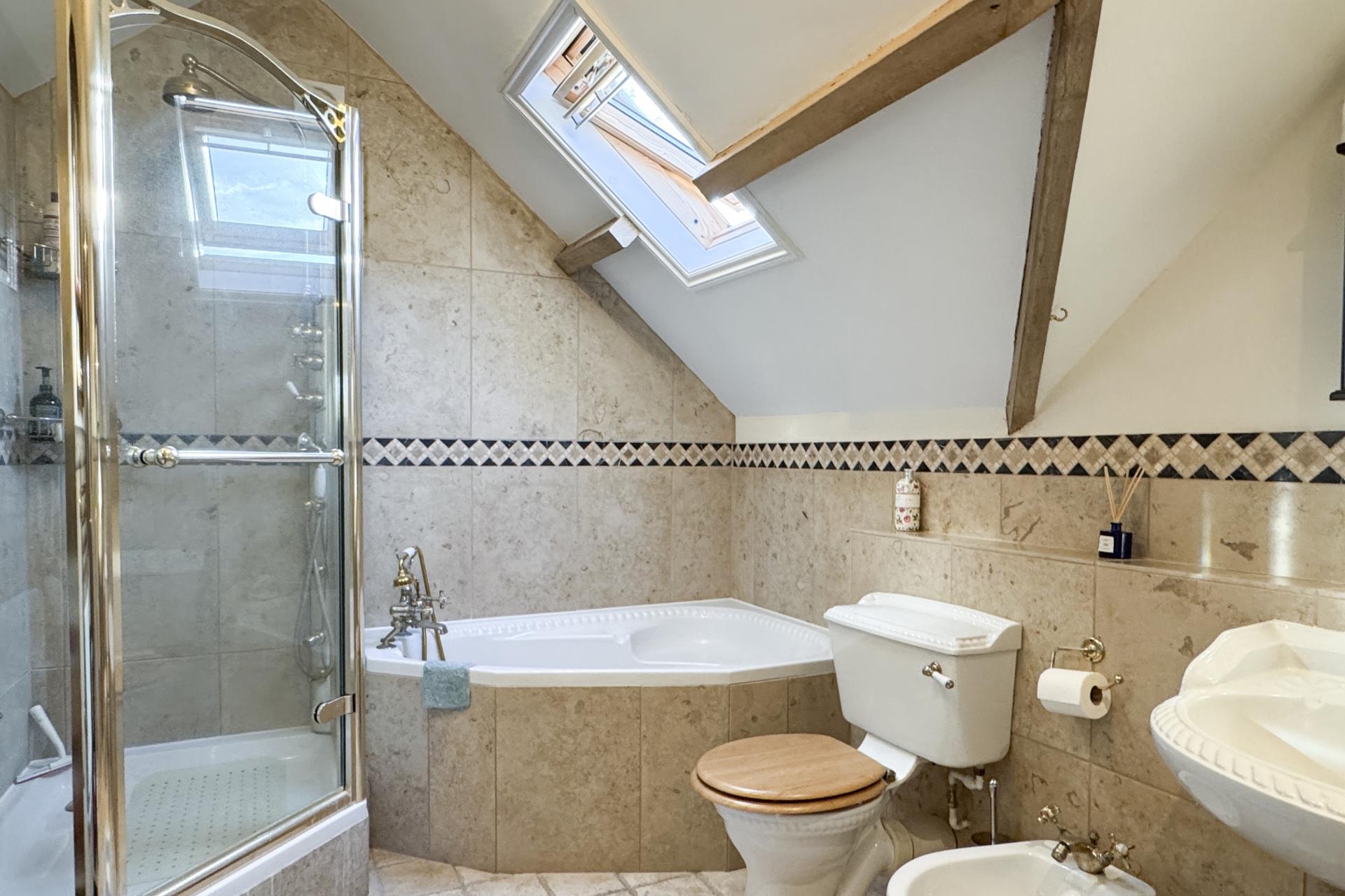 Upstairs, the property boasts three generous bedrooms. The 21’ master bedroom is a serene retreat with stunning exposed beams that add character and warmth. The second bedroom, measuring 19’, benefits from an en-suite toilet and sink. This floor is completed with a spacious family bathroom includes both a bathtub and a separate shower cubicle.