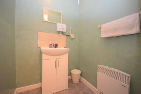 Vanity wash hand basin, tiled splash back, Triton electric water heater, electric wall heater, WC, extractor fan.
