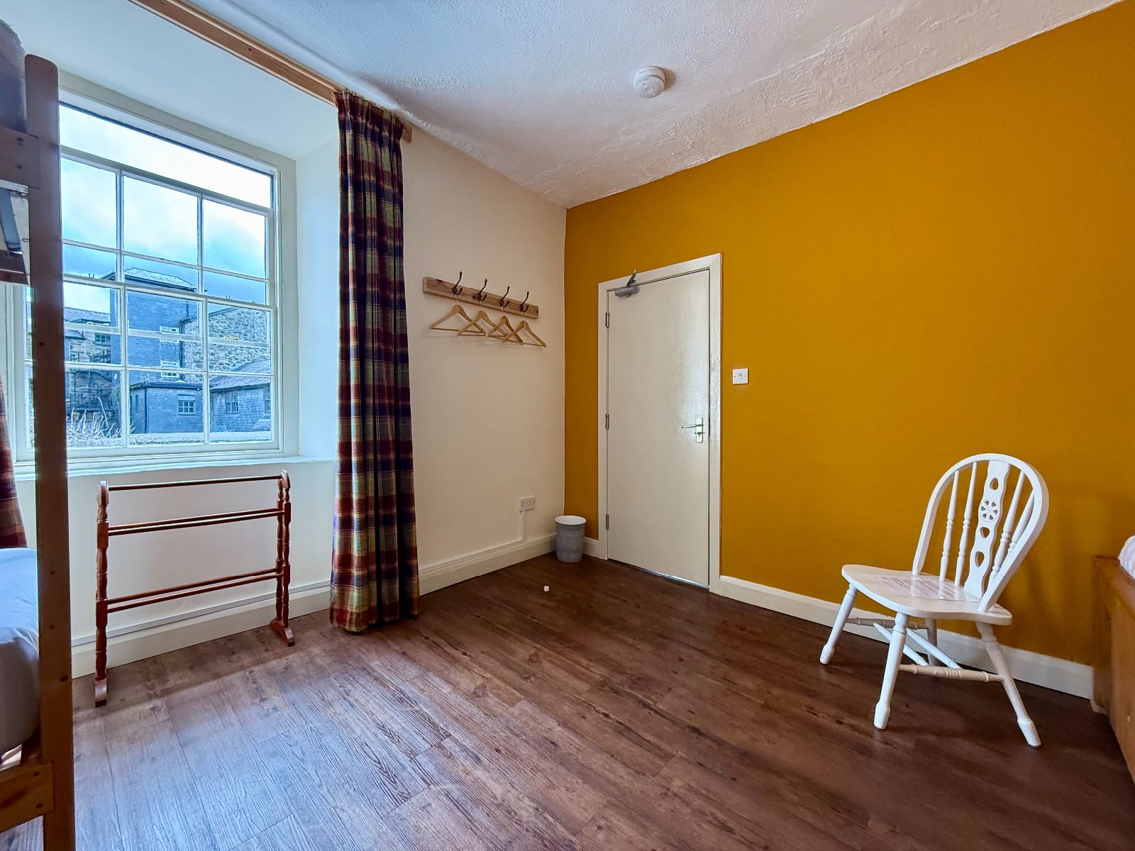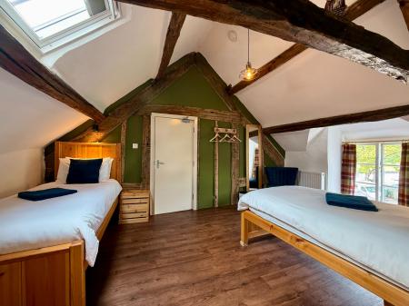 Velux to front, window to rear, exposed stone wall, exposed beams and A frames, radiator, laminate flooring.