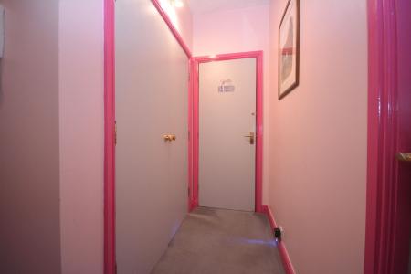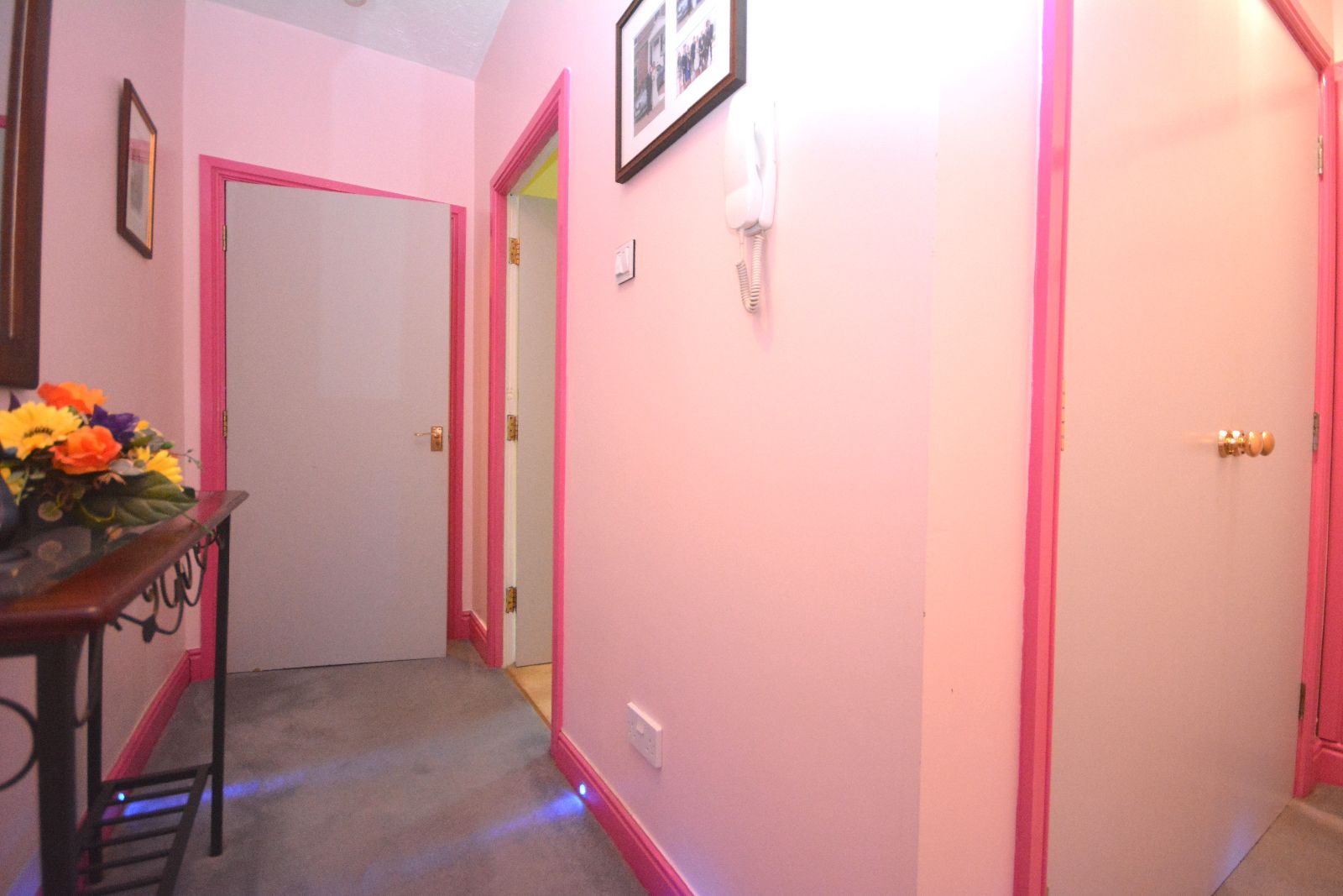 "L" shaped hallway, intercom system, skirting boards with LED lights, carpet.