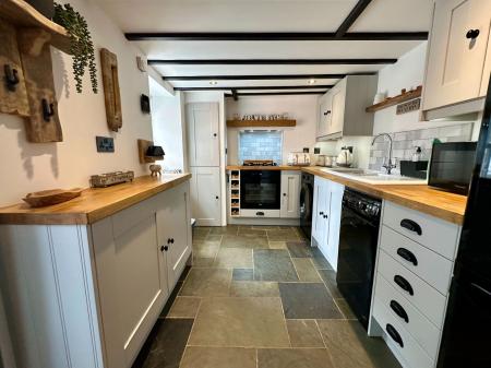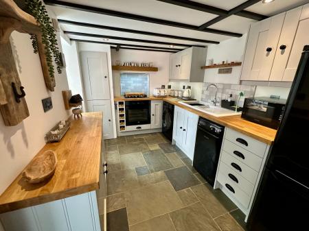 Six wall units, (1 housing Worcester combi boiler) eight base units under a butchers block timber worktop, tiled splash back, ceramic 1 ? sink and drainer, integral electric oven, four ring gas hob, space for washing machine, space for dish washer, space for fridge freezer, slate effect tiled flooring with underfloor heating