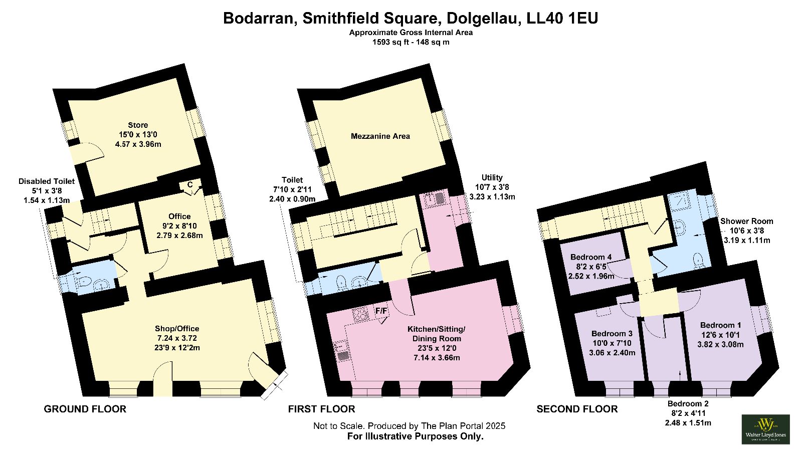 Ground Floor: Shop frontage, rear hallway, office, WC, and entrance hallway.