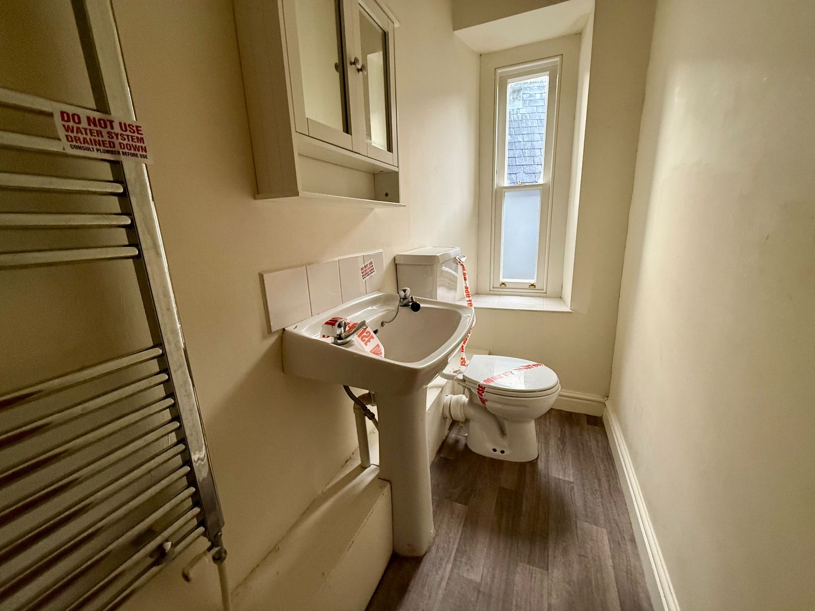 Window to side, low level WC, pedestal wash hand basin, heated towel rail radiator, cushion flooring.