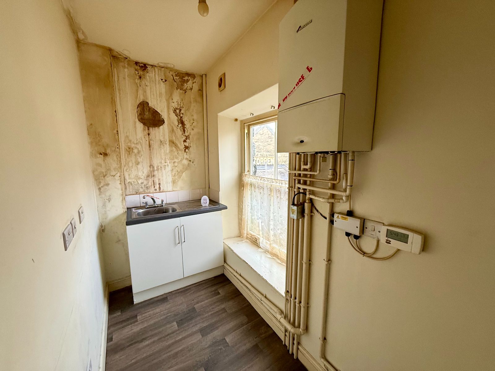 Window to side, Worcester boiler, base unit with stainless steel sink and drainer inset, cushion flooring.
