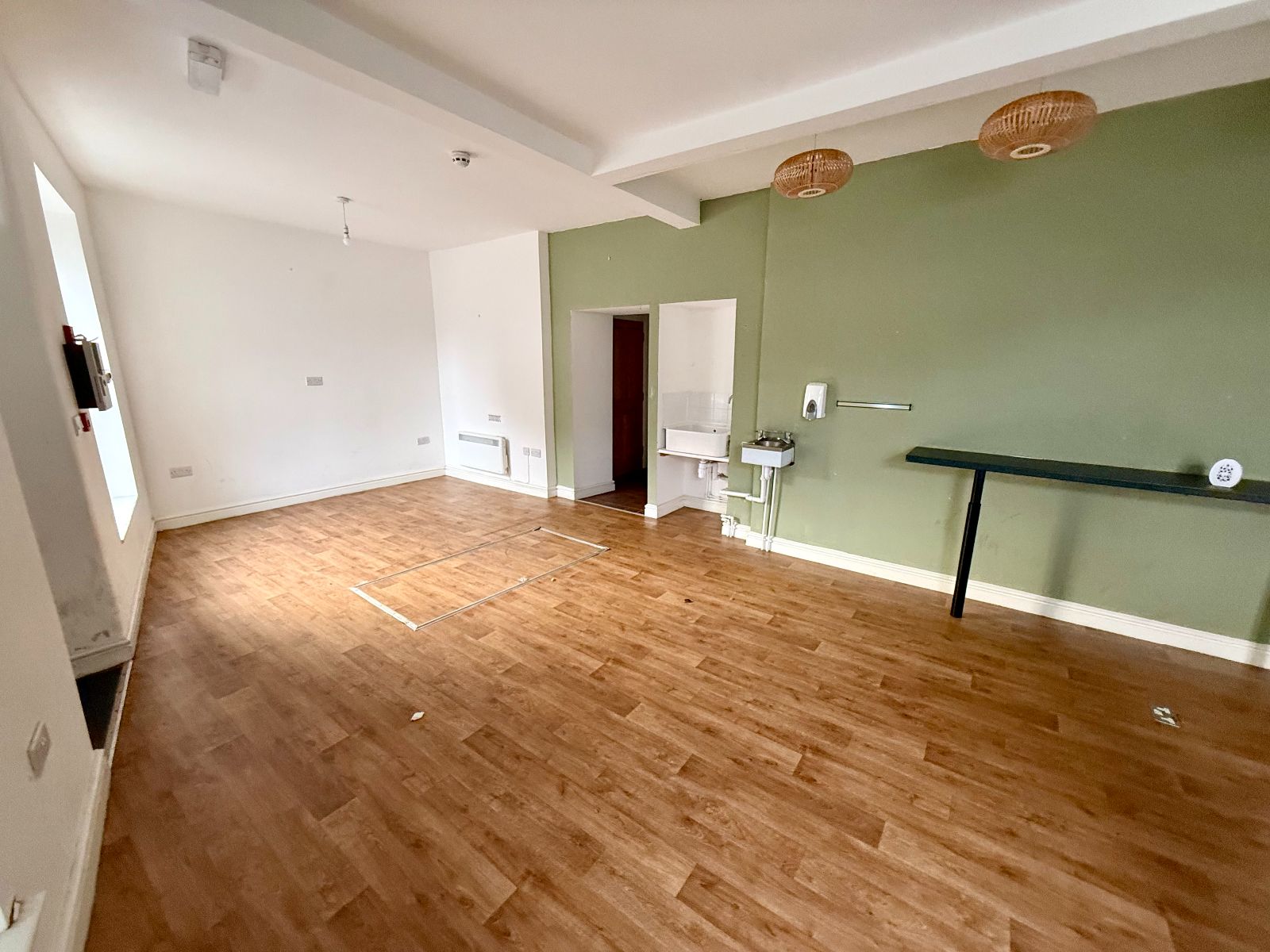 Two doors to front, 2 windows to side and window to front, electric blow heater on ceiling, Belfast sink, laminate flooring.