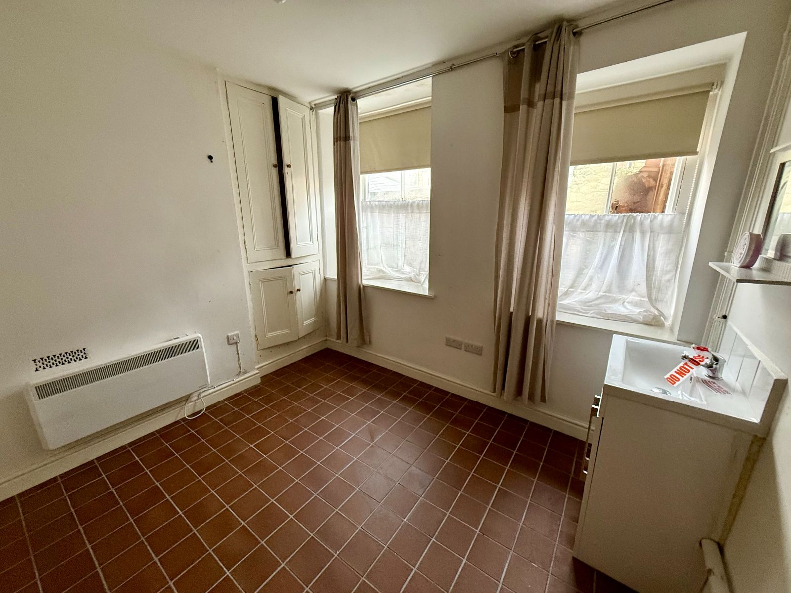 Two windows to side, fitted cupboards, quarry tiled flooring.